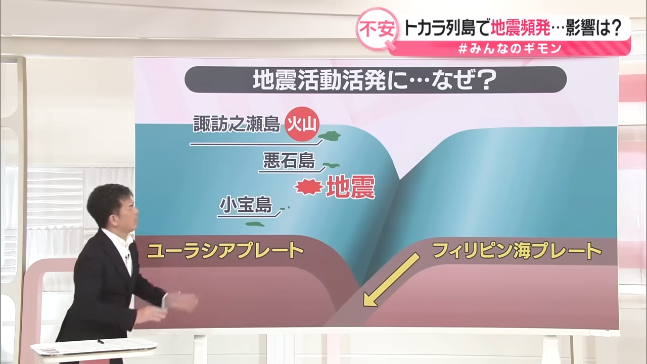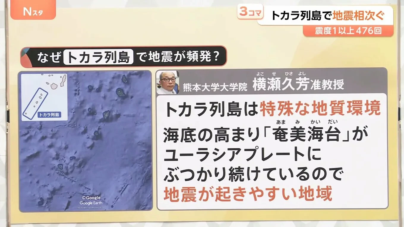 熊本大學研究所橫瀨久芳副教授指出,獨特的海底地形使該區域易發地震。他表示:「吐噶喇群島的崎嶇海底持續碰撞陸地板塊,導致頻繁的群震現象。」
