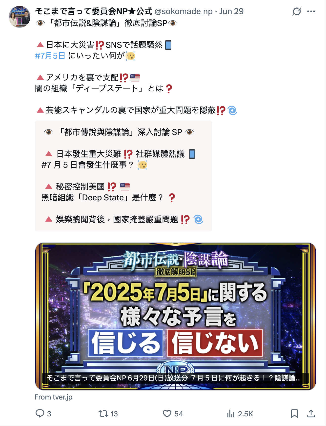 《そこまで言って委員会NP》表示因為香港著名風水師也預言日本將發生大地震,此消息在社群網絡上廣泛流傳,導致香港赴日旅客急劇減少。雖然日本政府已澄清此預言缺乏科學根據,日本氣象廳也否認並稱其為謠言,但香港人仍然因為此預言而感不安。