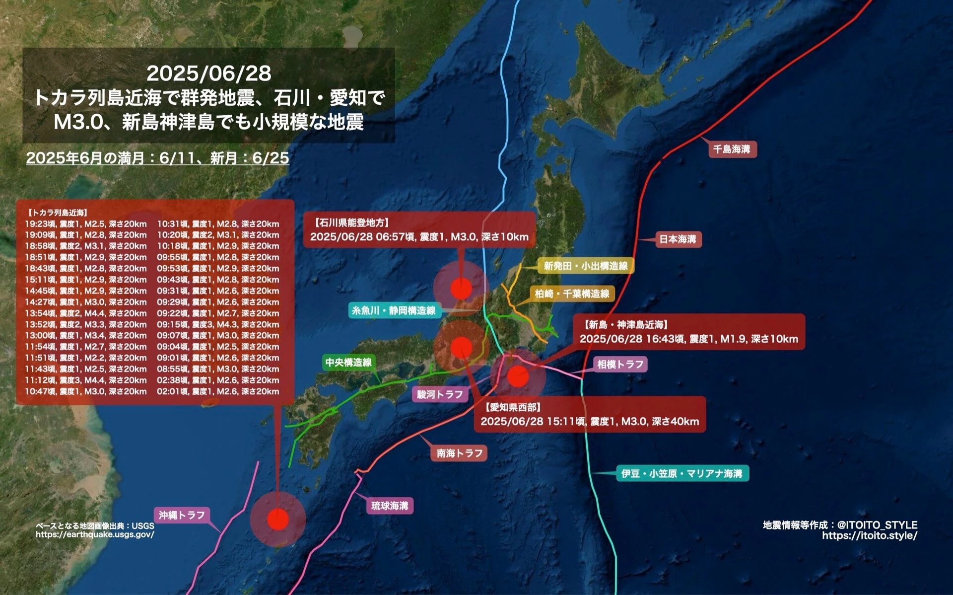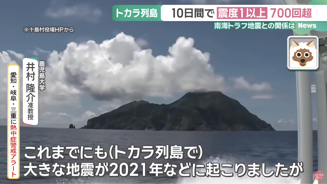 【日本地震/日本地震危機/鹿兒島地震/吐噶喇群島地震/鹿兒島大學】鹿兒島南部的吐噶喇群島自6月21日起,發生了800多次地震,最大震級為5.4級,連群島一帶居民都表示:「害怕得不敢睡覺。窪加上《我所看見的未來》「7月5日大災難」預言發生的日子只有3天,不少人都擔心漫畫中所指的「7月5日大災難」發生地點會否在鹿兒島?日本專家分析吐噶喇群島一周震足800次原因,亦有專家指出吐噶喇群島頻密地震,與備受關注的「日本南海海槽大地震無關」。