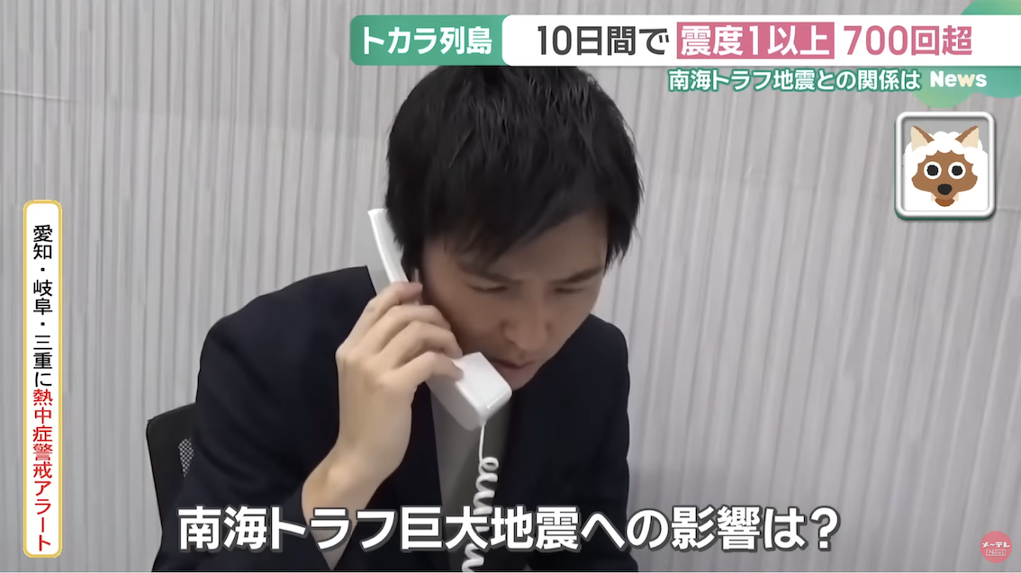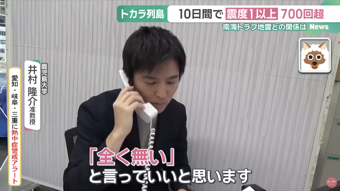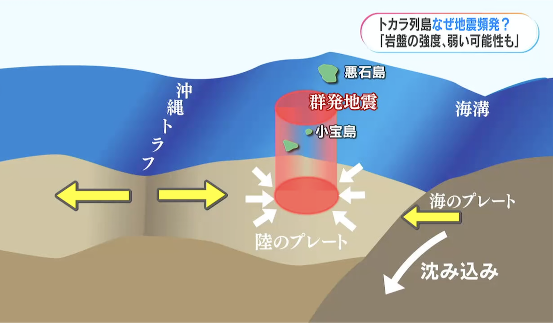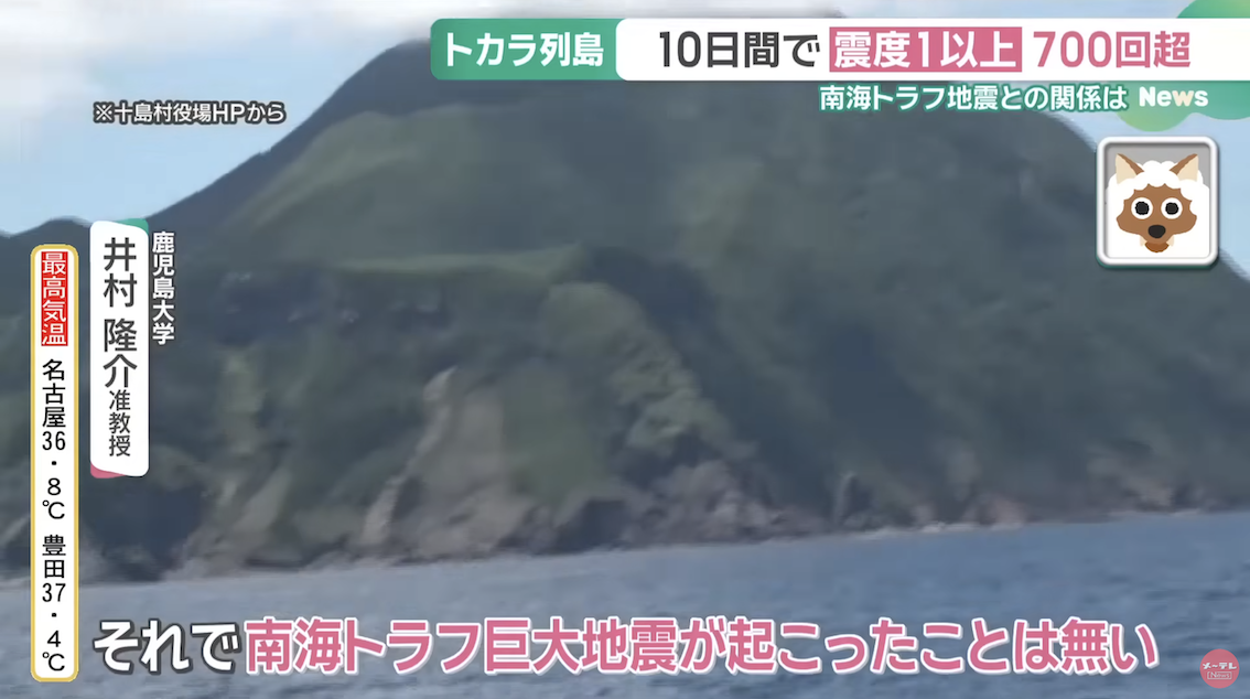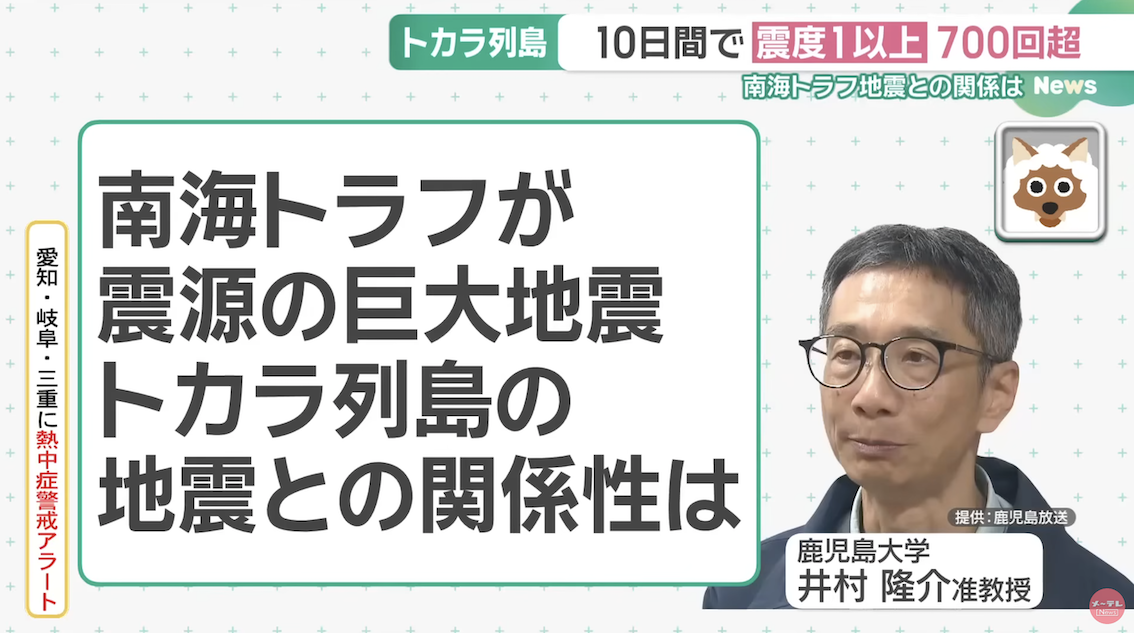 鹿兒島大學井村隆介副教授接受《Nagoya TV News》討論有關「吐噶喇群島地震」與「日本南海海槽大地震」之間的關係,有以下幾個論點: