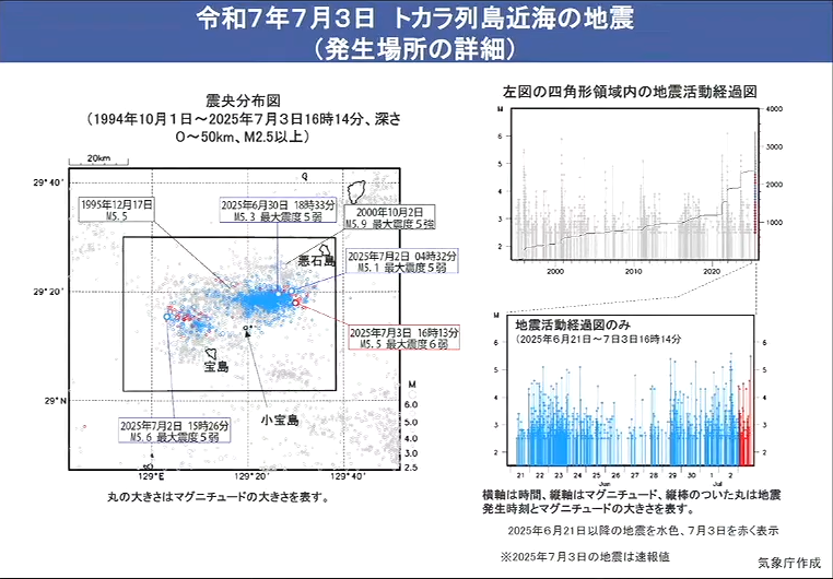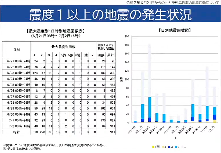 📊 據氣象廳統計顯示,鹿兒島縣吐噶喇列島近海區域,自6月21日8時起至7月2日16時,共11日半,當地已累計發生有感地震1050次;10小時內有60餘次。
