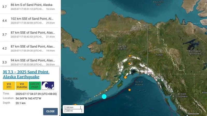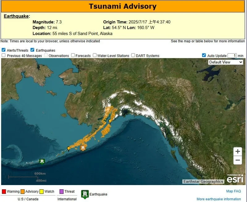 【全球地震/阿拉斯加地震/美國地震/海嘯】美國地質調查(USGS)表示7月16日美國阿拉斯加州近海今天發生規模7.3地震,震級是2025年第三強,僅次於3月8日緬甸7.7級地震及2月8日開曼群島7.6級地震。地震發生後,美國國家海洋和大氣管理局(NOAA)於阿拉斯加半島大部分地區發布了海嘯預警(advisory),預警範圍甚至延伸至阿拉斯加大陸最南端。