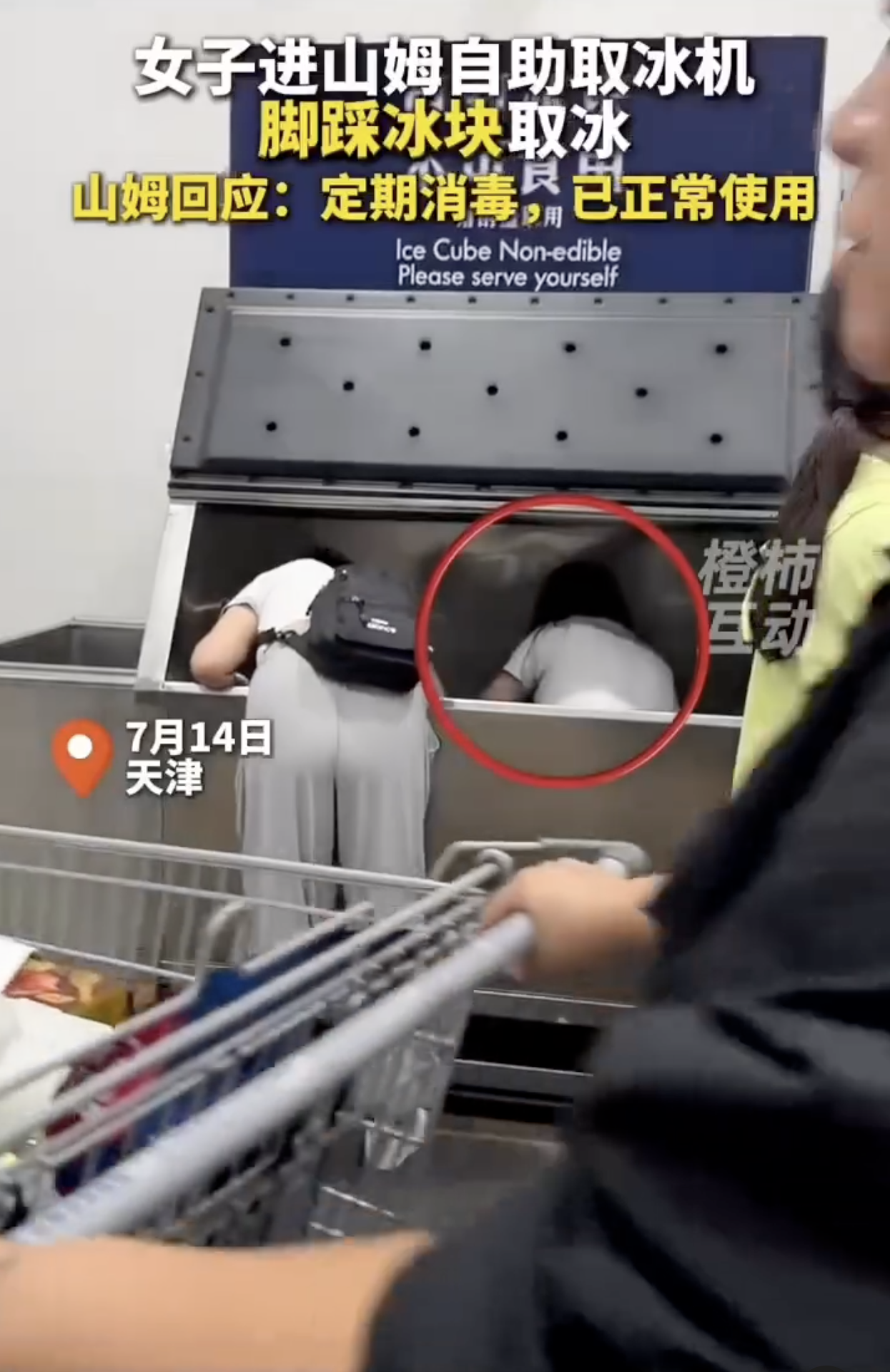 1️⃣ 有網友拍到一名女子鑽進山姆超市的開放式自助取冰機(機器上有註明非食食冰)