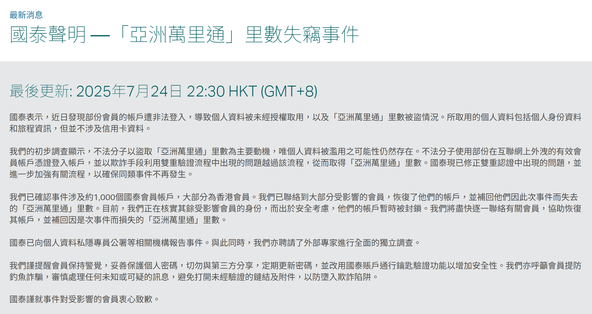 ✅ 國泰航空已聯絡大部分受影響會員,主動將被盜用的里數補回賬戶,同時恢復帳戶正常使用權限。