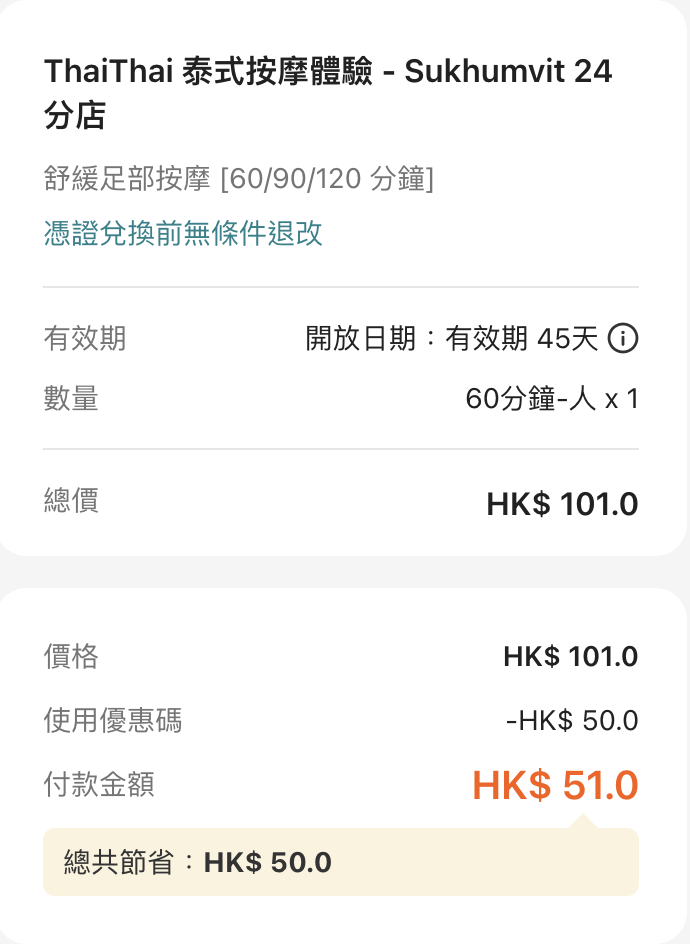 第一個推介係鄰近Phrom Phong站嘅ThaiThai 泰式按摩,出名多款嘅精油按摩套餐,按摩時間由60分鐘至120分鐘不等,價錢介乎HK$100至$408。大家咪以為得HK$50優惠無好嘢揀,ThaiThai嘅「舒緩足部按摩」60分鐘套餐原價只係HK$101,再輸入優惠碼之後,套餐只需要HK$51,就可以按腳60分鐘,抵玩!