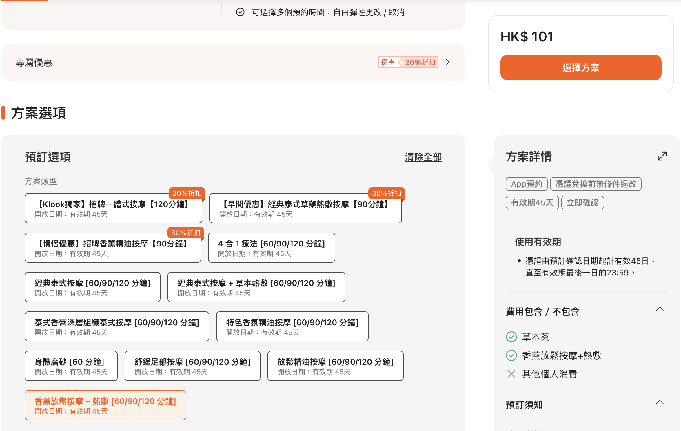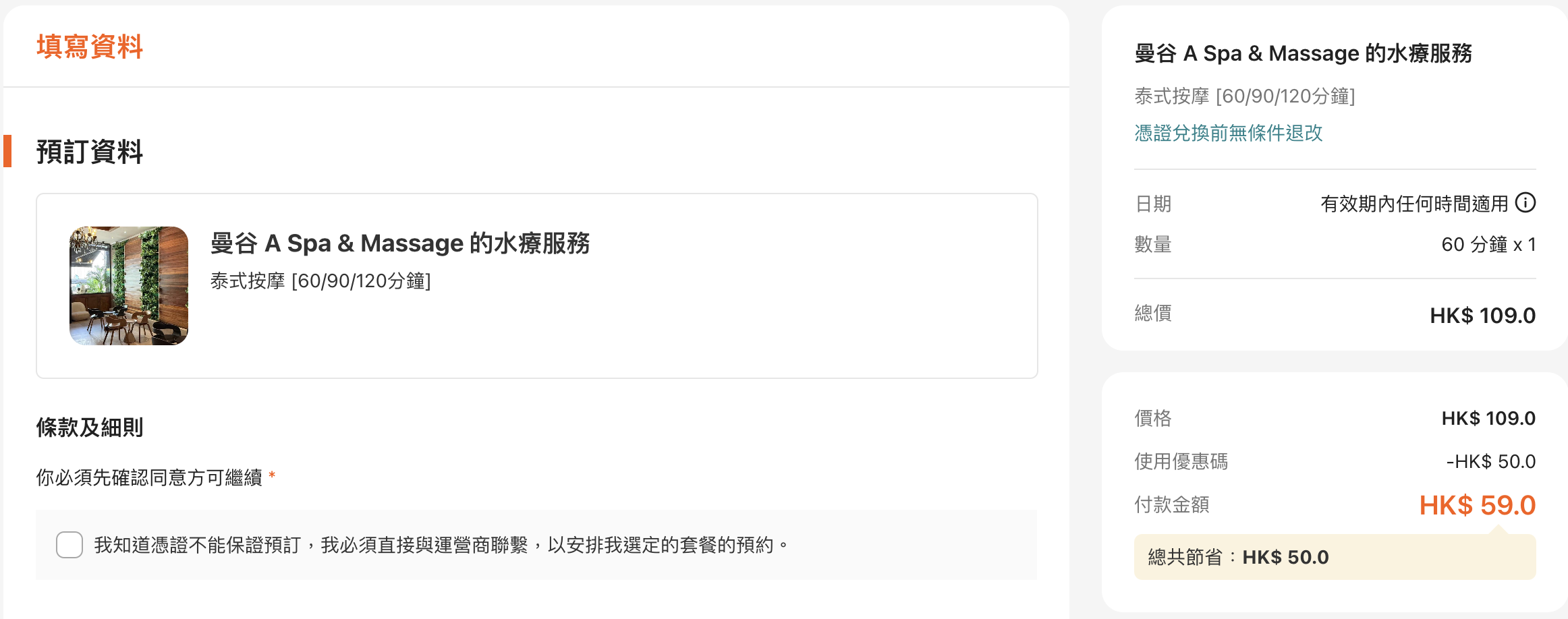 你無睇錯、我無講錯!如果你嫌足底按摩唔夠喉,咁60分鐘全身泰式按摩又得唔得?另一間「曼谷 A Spa & Massage」同樣提供超多款按摩套餐,包括有熱石及身體磨砂按摩、草本球按摩等。想用盡優惠最抵玩的話,60分鐘泰式按摩原價只需要HK$109,再加埋優惠碼折後HK$59,超平!係咪覺得即使減HK$50,都仲有好多選擇呢?