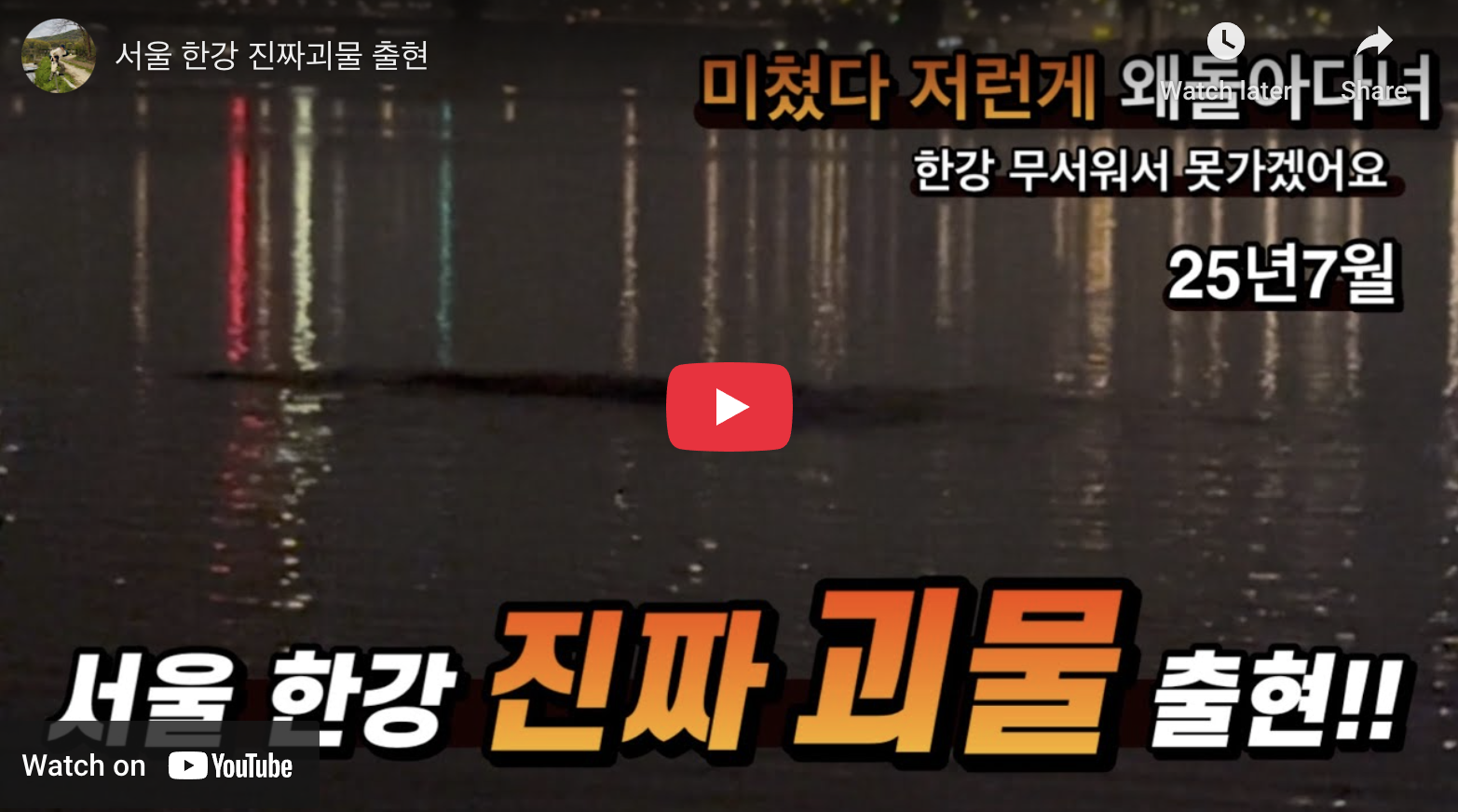 【全球異象/天災先兆/水怪/神秘生物/首爾旅遊/首爾漢江/汝矣島/不明生物】一名南韓釣客在漢江釣魚時,拍攝到水中出現不明水底生物,引發網友熱議。有網友睇片後聯想到奉俊昊導演2006年拍攝的電影《韓流怪嚇》主題是漢江出現怪物,究竟是電影成真,抑或另有真相,網民正熱烈討論中。