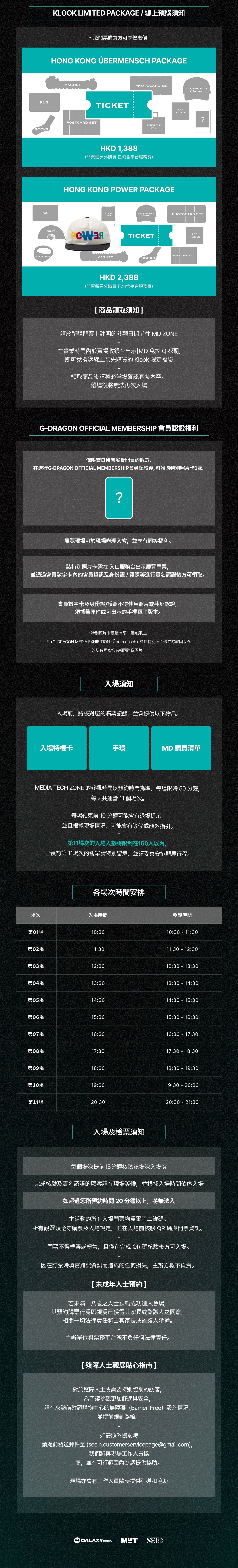 有興趣入場嘅朋友,可以透過以下連結購買入場券,售價HK$188張,已經包包括一張MEDIA TECH ZONE及MD ZONE入場QR CODE憑證。如果購買門票套餐的話,除咗門票之外,仲送POWER帽子_ORIGINAL( POWER BALL CAP_ORIGINAL)、襪子、照片卡、明信片、戒指、抽繩袋、冰箱貼、扇子、拼圖及特典照片卡一張,並可獲得G-DRAGON全息影像拍攝券一張。
