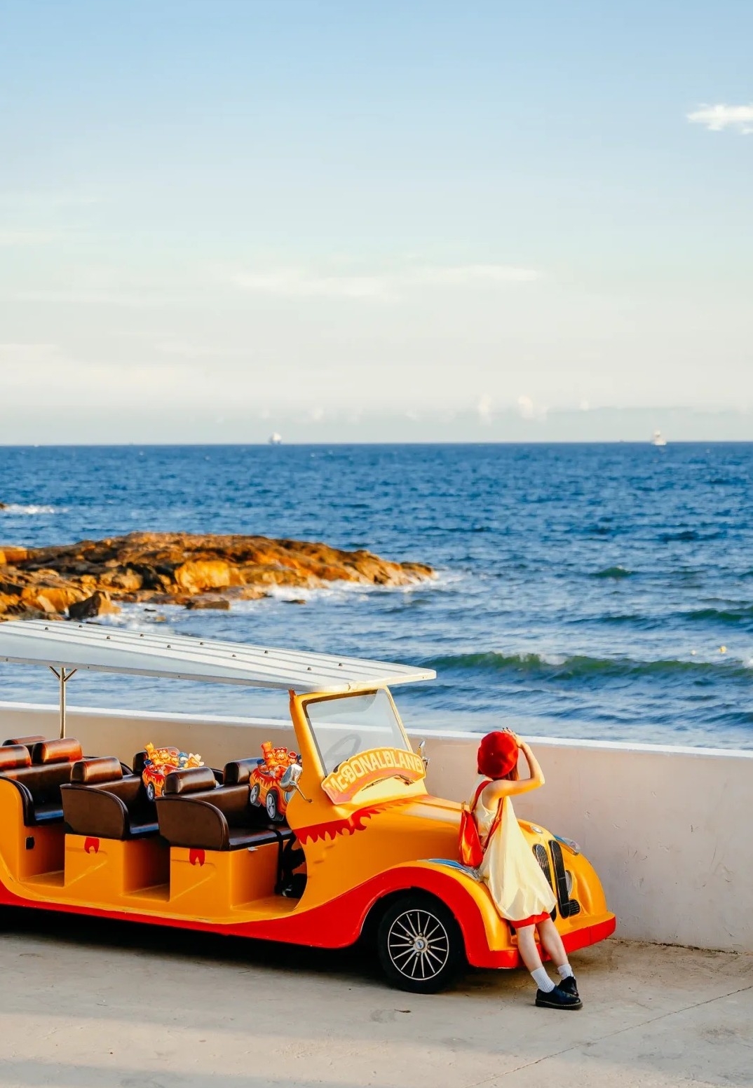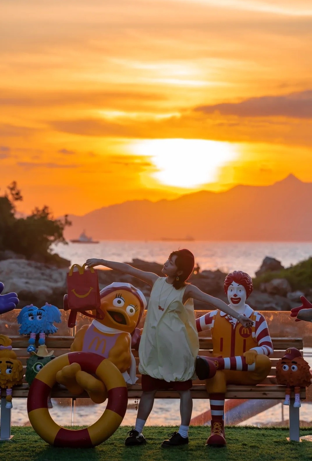 巨型薯條長椅+開心樂園餐剪影,日落金粉灑落,秒出電影感大片。