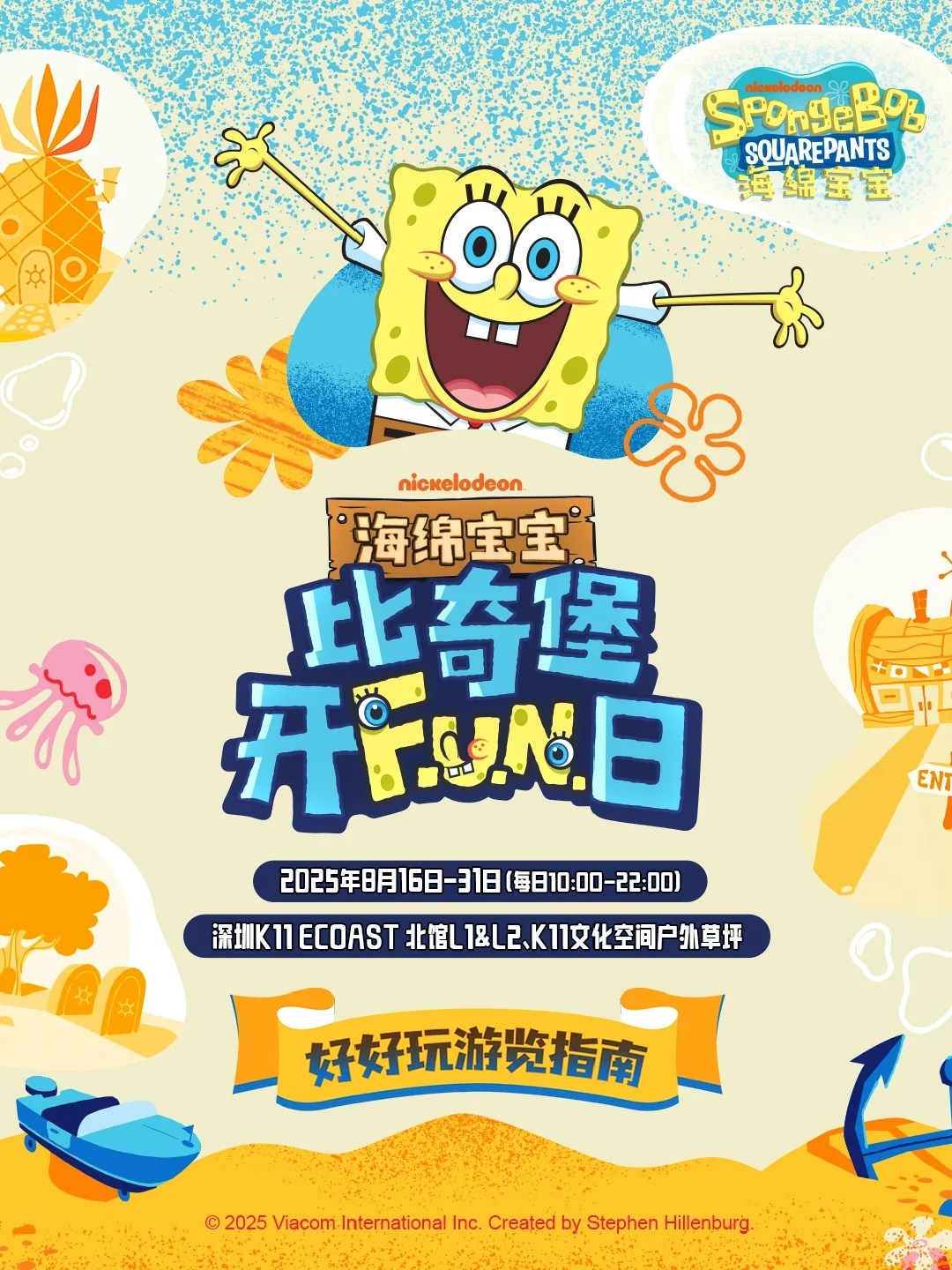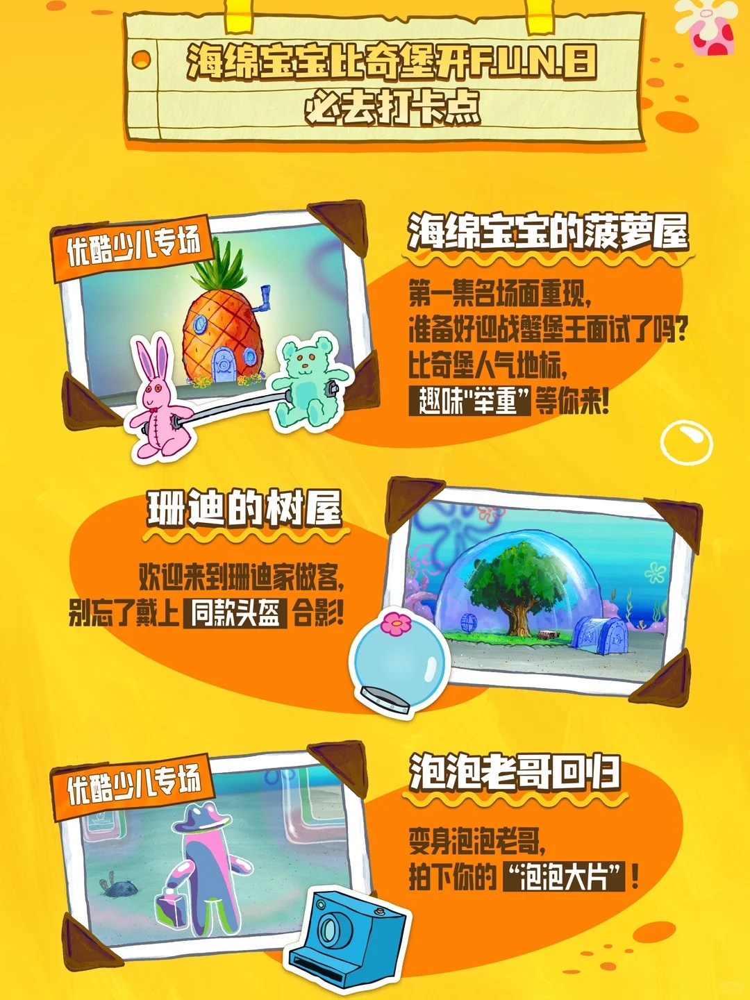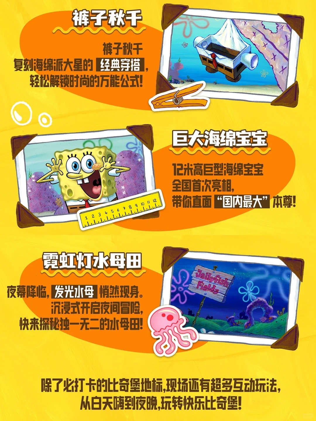 「海綿寶寶比奇堡開 F.U.N.日」本周末開設,亮點有在全中國首次亮相的12米巨型海綿寶寶,另外亦會將動畫中亦海綿寶寶、蟹老闆、派大星等生物生活的海底城市「比奇堡」7大場景重現,Fans一定要來朝聖。
