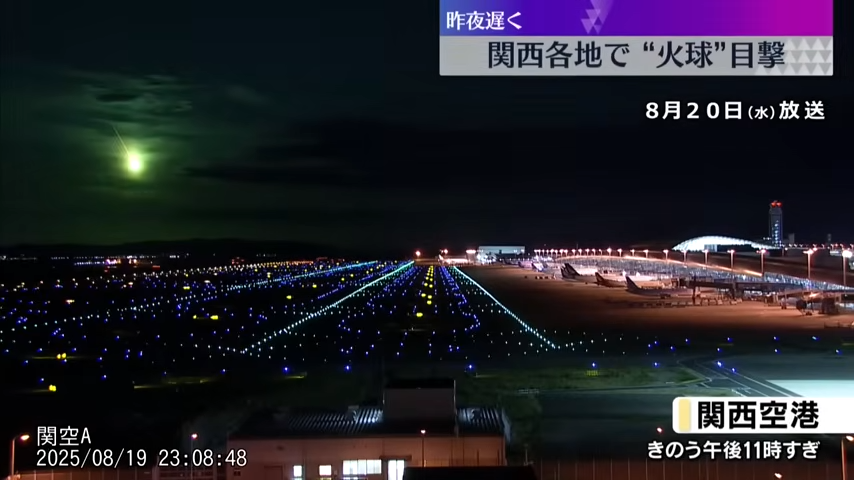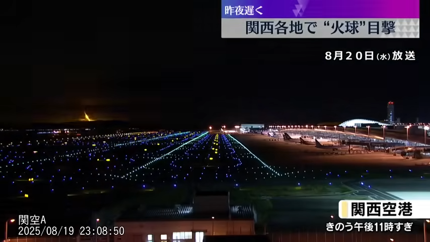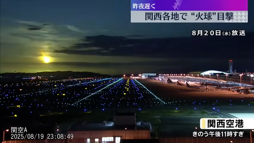 🟡日本放送協會(NHK)設於鹿兒島、松山、關西與神戶機場的監視攝影也在8月19日下午11時8分左右拍攝到火球明亮地劃過天空的畫面。![]()