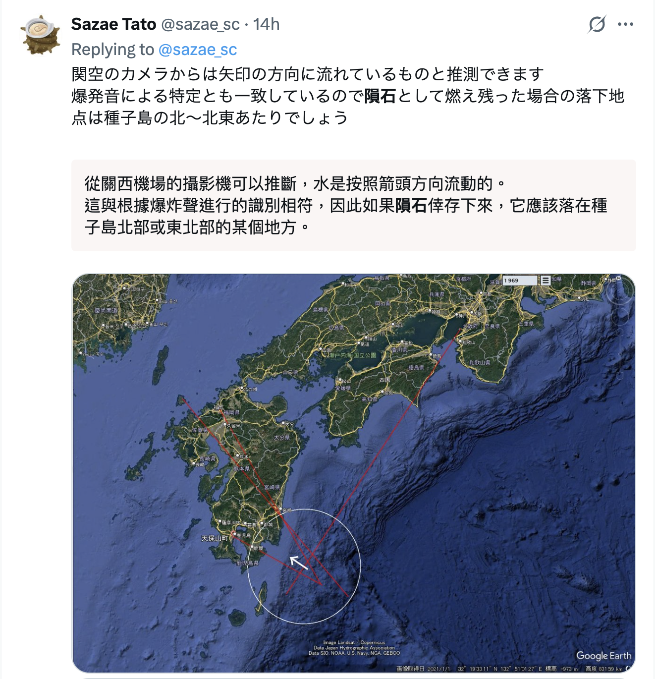🟠鹿兒島縣和宮崎縣等地於午後11時左右,社群媒體上陸續發布了火球目擊訊息。