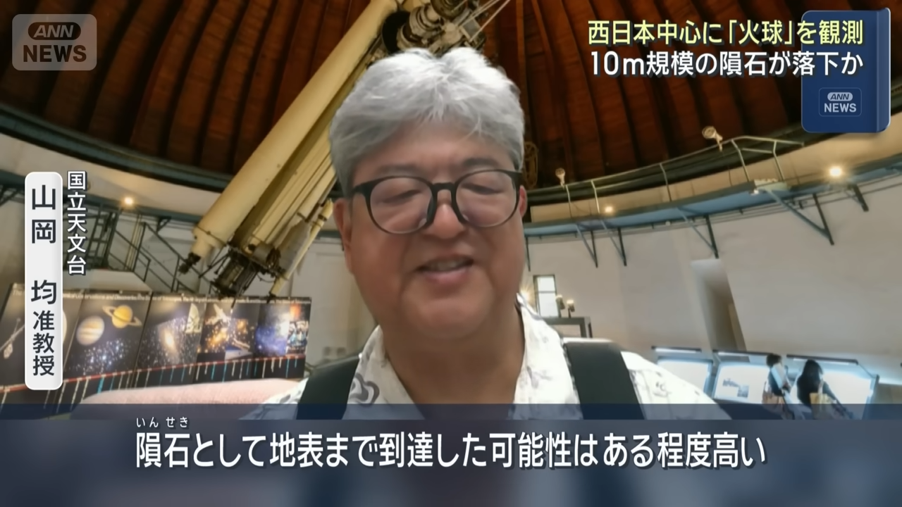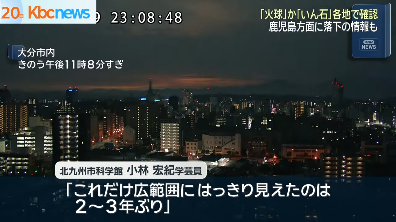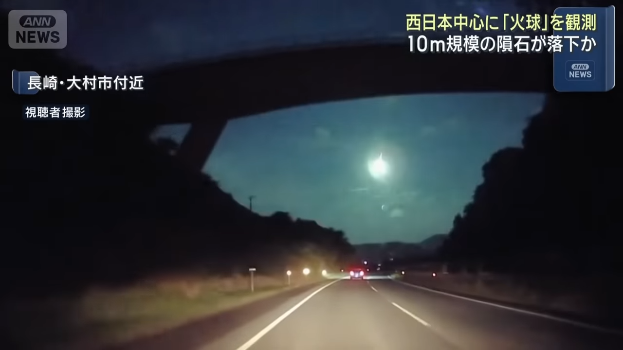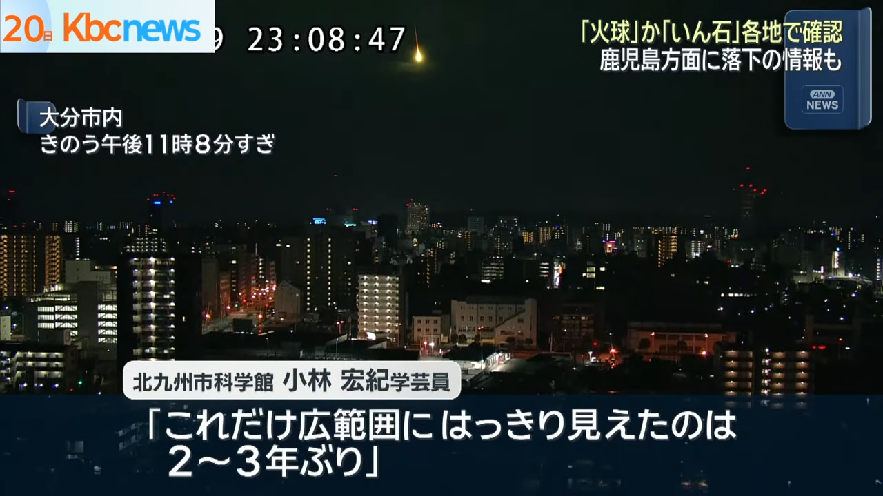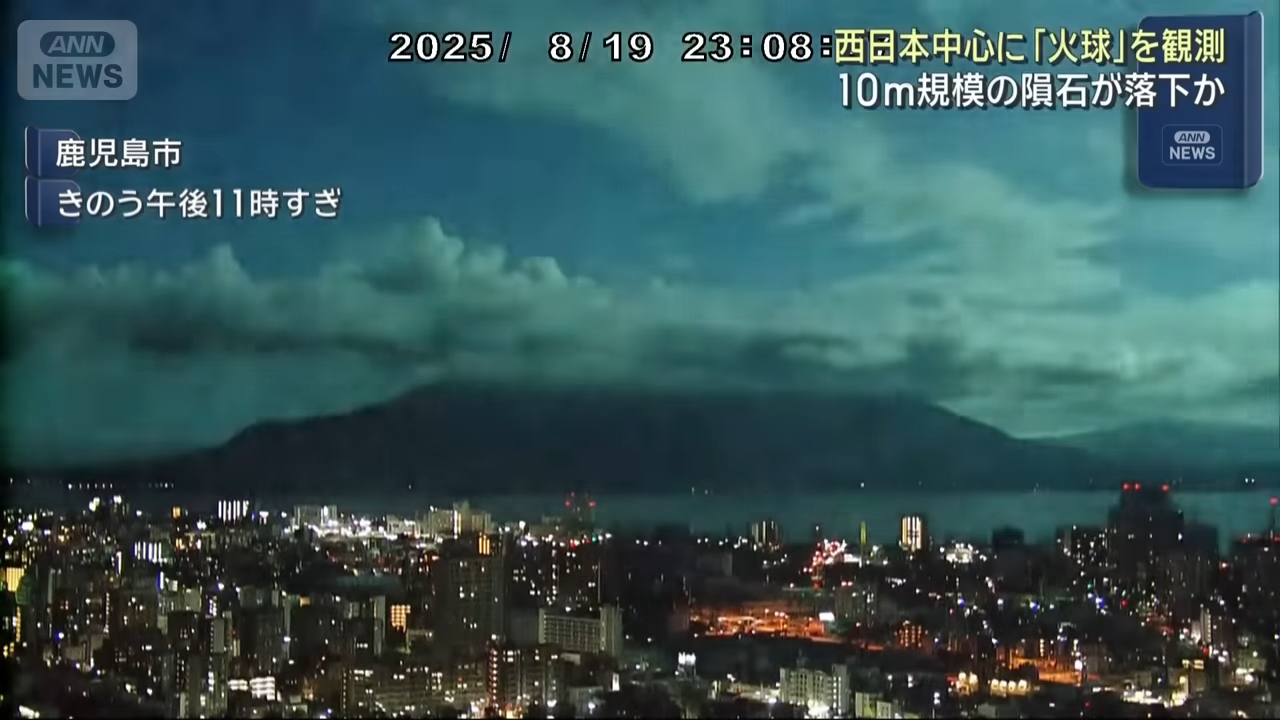 【天文奇觀/自然災害/隕石/隕石撞地球/神秘事件/日本旅遊/九州/四國/關西機場/大阪/鹿兒島/日本神秘光球】2025年8月19日深夜約11時,日本九州、四國及關西多地、包括鹿兒島、宮崎、松山、高知及大阪等地的民眾目擊到一個神秘的綠色火球劃過夜空,瞬間令漆黑的天空染紅,如白晝般明亮,有民眾甚至聽到巨大的爆炸聲,不少民眾聯想到自然災害,如有鹿兒島居民甚至以為是櫻島火山爆發、有的則認為是隕石撞地球。NHK(日本放送協會)請專家分析這個神秘光球究竟是甚麼?