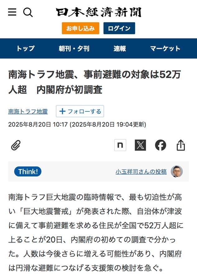 【日本地震/日本南海海槽/日本南海海槽地震/日本內閣府/日本地震避難計劃】根據日本經濟新聞報導,日本內閣府於2025年8月20日發布最新公告,針對南海海槽地震一旦威脅升高,已要求地方政府對高風險沿海地區實施「事前避難」規劃。日本政府要求沿海高風險市町村逾52萬人提前一週疏散,涉及130個市町村及兩類居民。這是日本政府首次全面針對南海海槽地震擬定事前大規模避難措施,旨在大幅降低人員傷亡及災害損失。