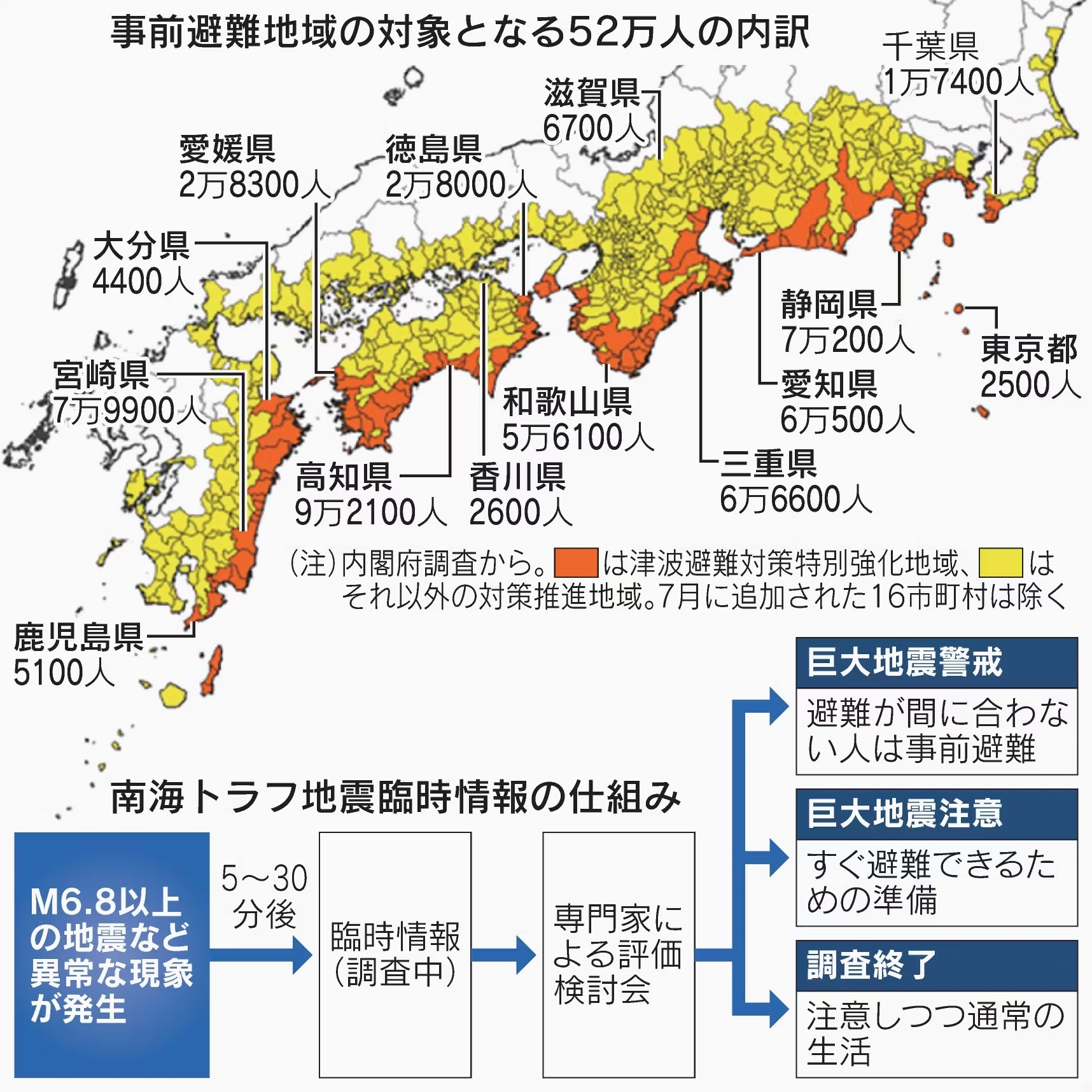 2025年8月20日,內閣府最新公布:當氣象廳發布南海海槽地震臨時情報中迫切程度最高的「巨大地震警戒」時,預計海嘯會在地震發生後數分鐘內襲擊本土部分地區,來不及即時疏散的民眾須提前一週避難。