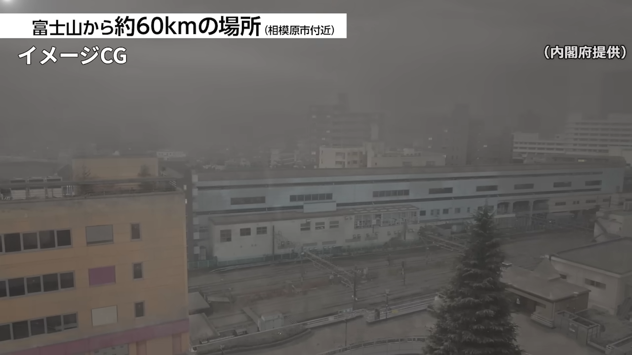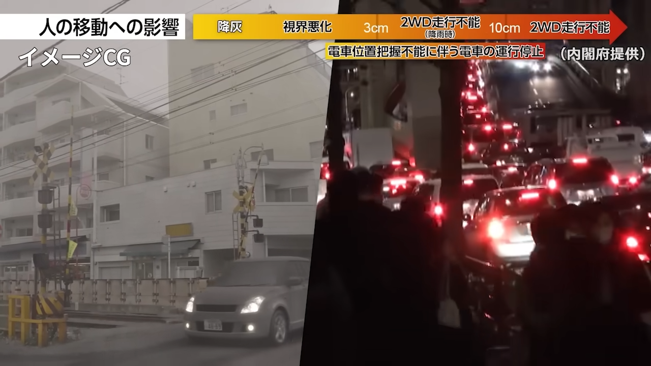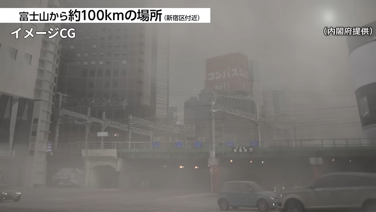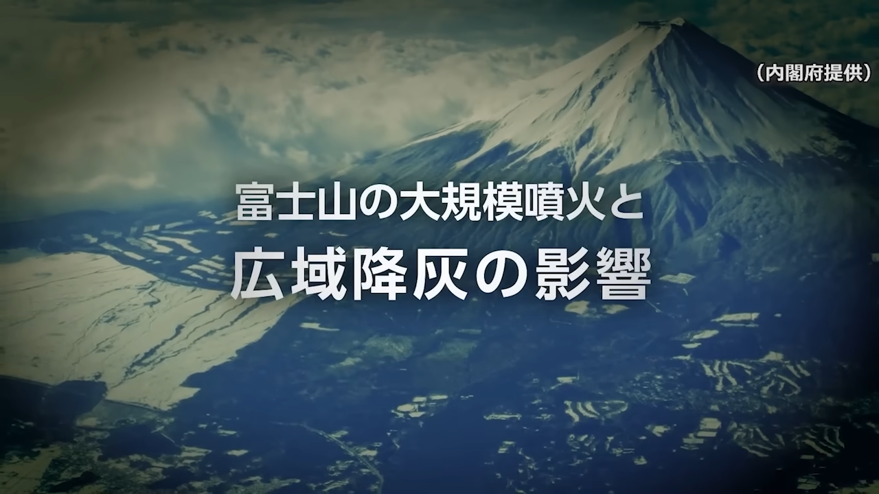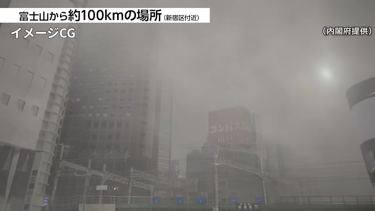 【模擬基準】以1707年,日本寶永年代富士山噴火同等規模災害為基準,利用電腦圖像技術,結合真實歷史影片和照片呈現火山灰對首都圈的衝擊。