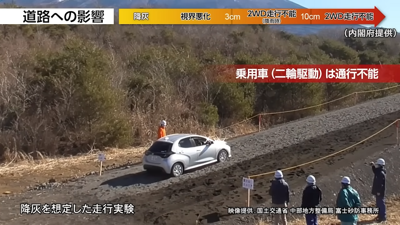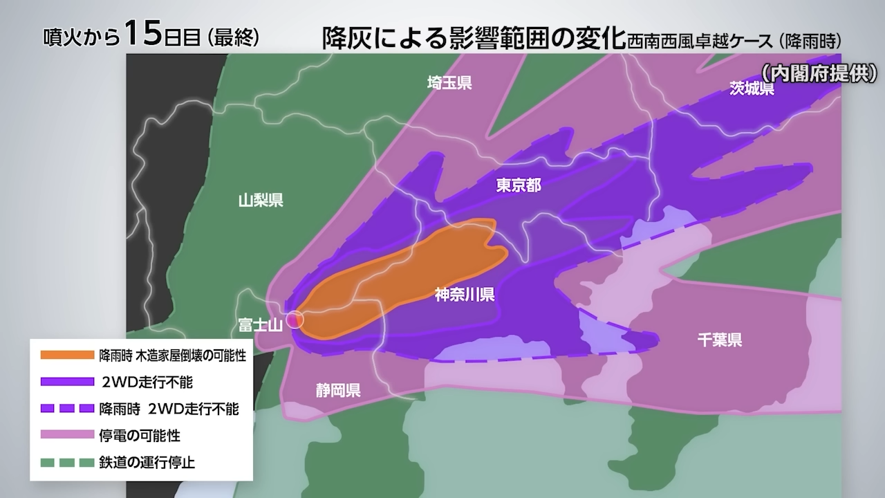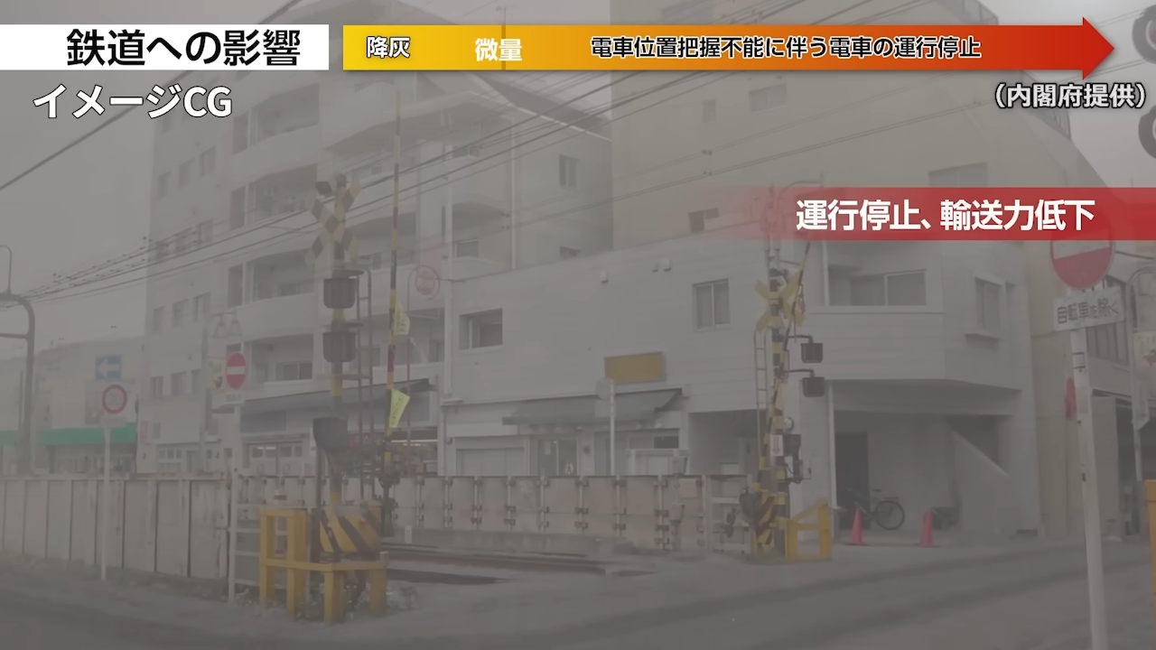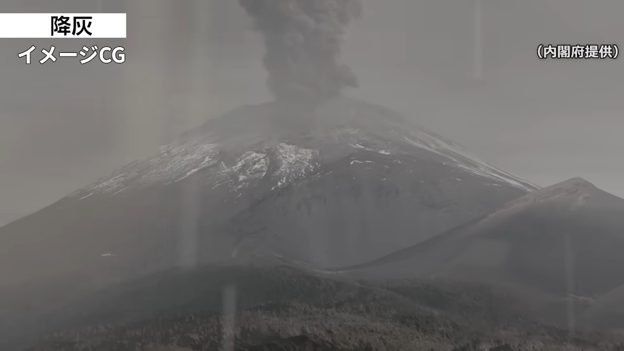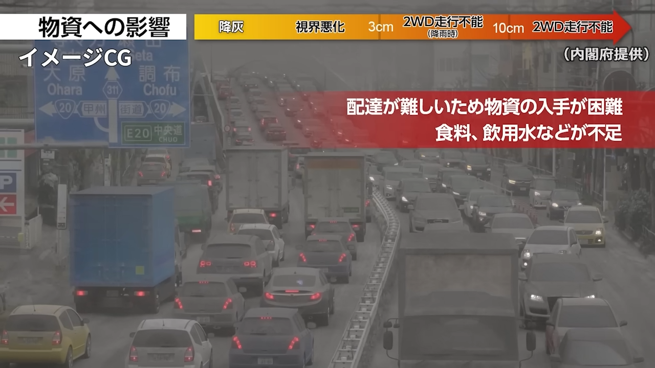【模擬基準】以1707年,日本寶永年代富士山噴火同等規模災害為基準,利用電腦圖像技術,結合真實歷史影片和照片呈現火山灰對首都圈的衝擊。