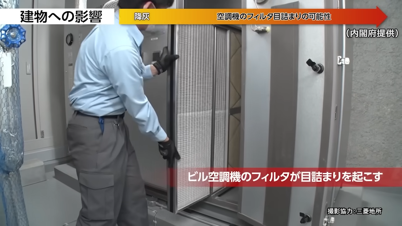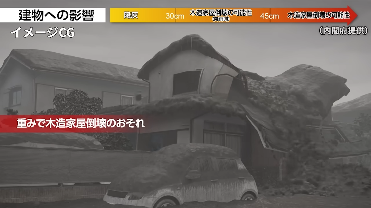 ▪︎ 火山灰堆積超過30厘米遇雨會增加重量,可能導致木造房屋倒塌。