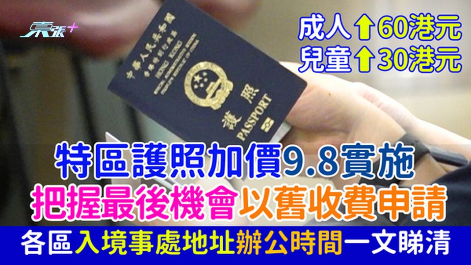 【特區護照/特區護照加價/香港特區護照/保安局/入境事務處/公共服務加價】保安局及入境處早前宣布香港特區護照申請費用將於2025年9月8日調整,成人32頁、10年有效期的加60港元,小童的亦加價30港元。若市民的特區護照即將到期,記得把握於9月8日前申請以享舊有收費。即睇各區入境事處地址及辦公時間,另而證件自助服務站地址。