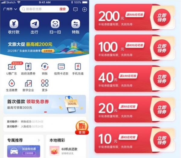 領取方法:於上述日子,公眾可透過雲閃付APP、「廣東文旅」微信公眾號領取消費券並線下核銷,或喺廣州廣交會展館A區旅博會現場刷卡消費,享受滿減優惠,最高滿¥999元減¥200元。滿¥499元減¥100元、滿¥199元減¥40元、滿¥99元減¥20元、滿¥49元減¥10元。(消費券數量有限,先到先得,領完即止。)