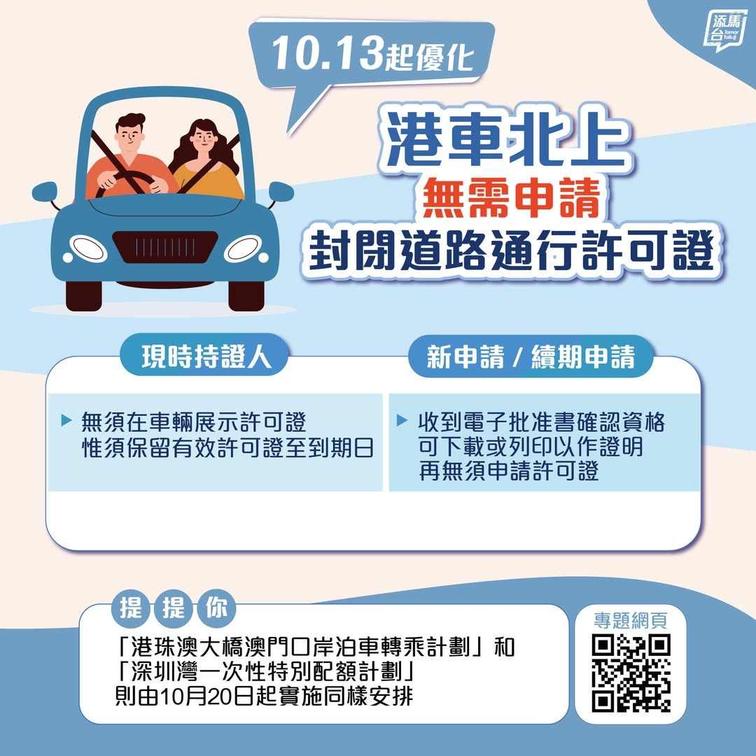 【港人北上/港人去深圳/港車北上/大灣區旅遊】運輸署宣布獲批准參與「港車北上」計劃的車輛,將於2025年10月13日起毋須再申請封閉道路通行許可證(俗稱「禁區紙」),車輛擋風玻璃上亦毋須展示許可證。同期,「港珠澳大橋澳門口岸泊車轉乘計劃」及「深圳灣一次性特別配額計劃」的車輛由10月20日起實施相同安排。此新措施提升跨境駕車效率,預計惠及超過10萬輛合資格車輛。