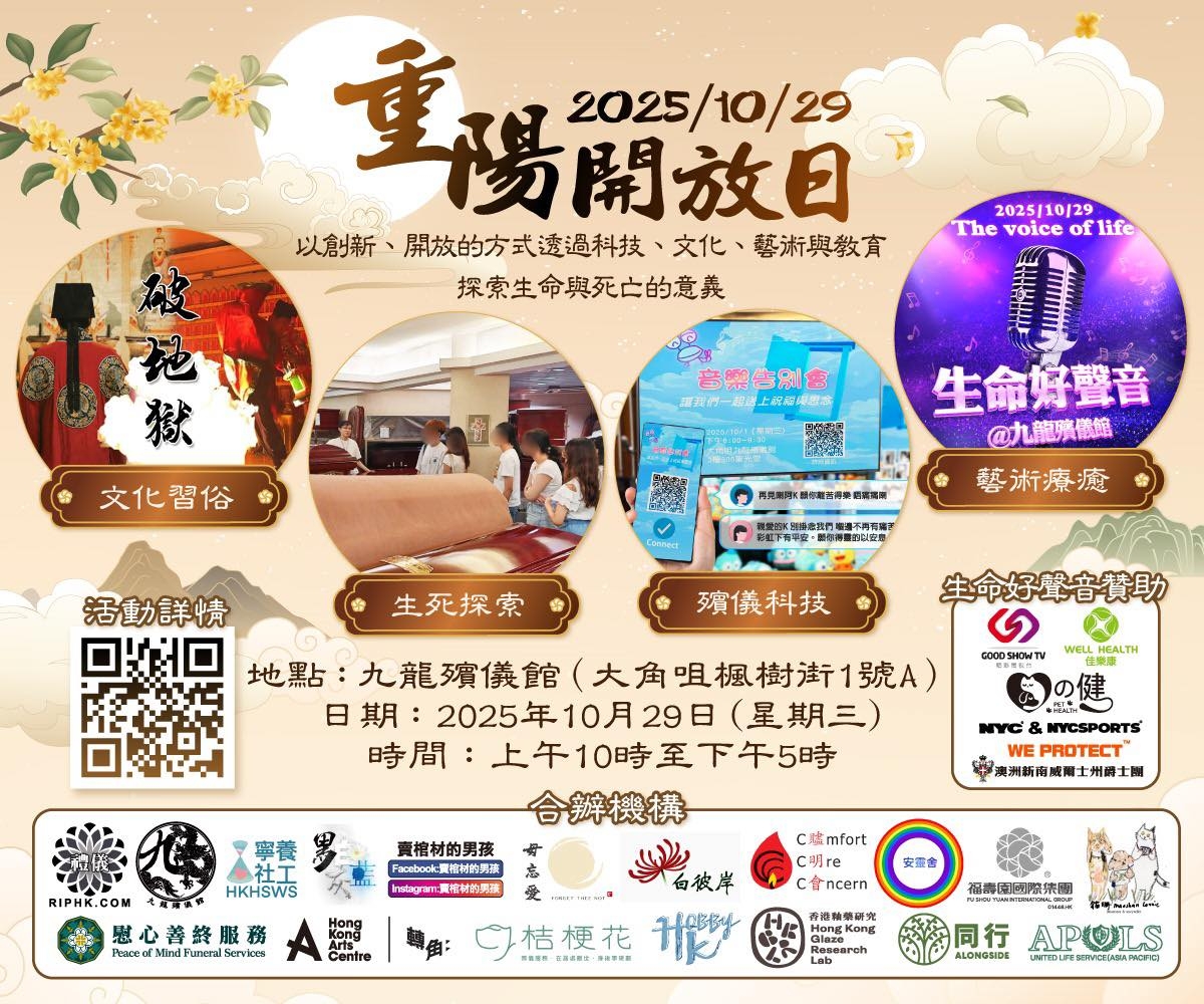 九龍殯儀館將於重陽節當日舉辦「開放日2025」,向公眾開放殯儀館空間,透過系列講座、音樂表演、藝術展覽與儀式體驗推廣生死教育。活動旨在讓參加者更了解殯儀文化與生命意義,同時打破「殯儀館等於禁忌」的刻板印象。
