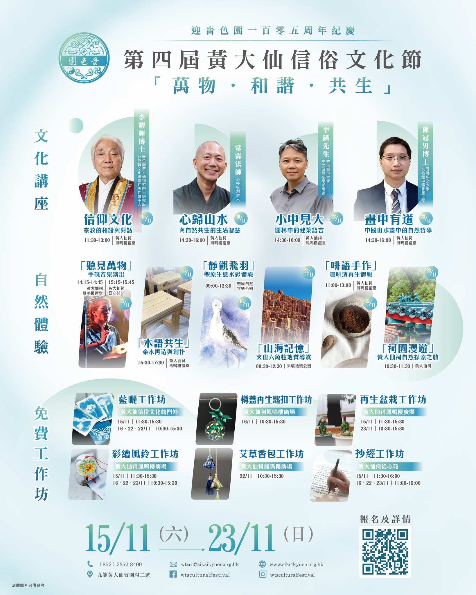 【香港好去處/黃大仙祠/嗇色園/文化節/免費活動】「黃大仙信俗」自2022年列入國家級非物質文化遺產後,每年11月嗇色園黃大仙祠都會舉辦「黃大仙信俗文化節」。今年(2025年)活動以「萬物‧和諧‧共生」為主題,於11月15日至23日舉行,設有20多場免費活動,包括文化講座、自然體驗、黃大仙祠導賞團及12個免費工作坊等。想找香港免費親子好去處,即睇「黃大仙信俗文化節2025」詳情及報名方法。