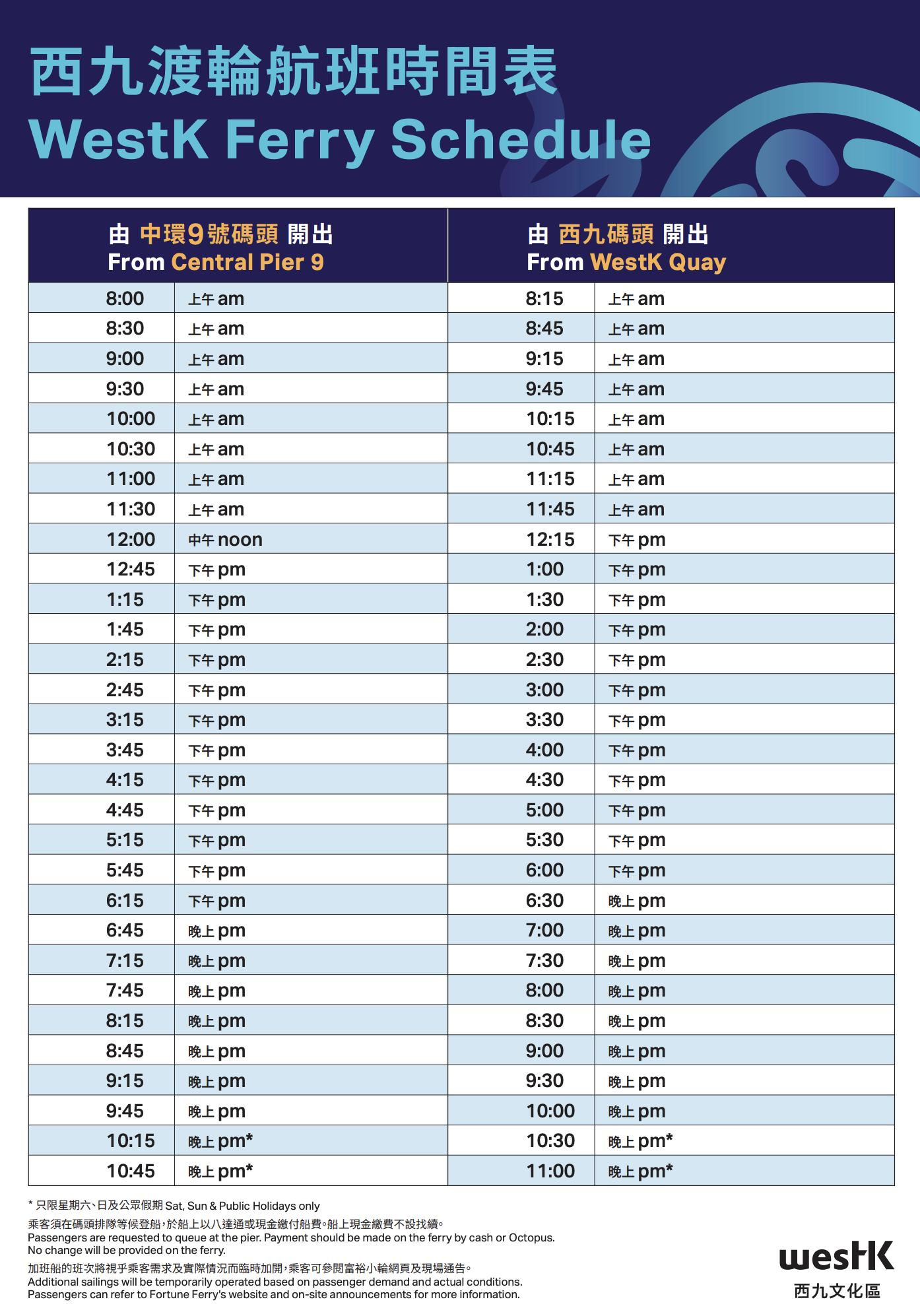 - 上落船地點:西九文化區西九碼頭/中環九號碼頭