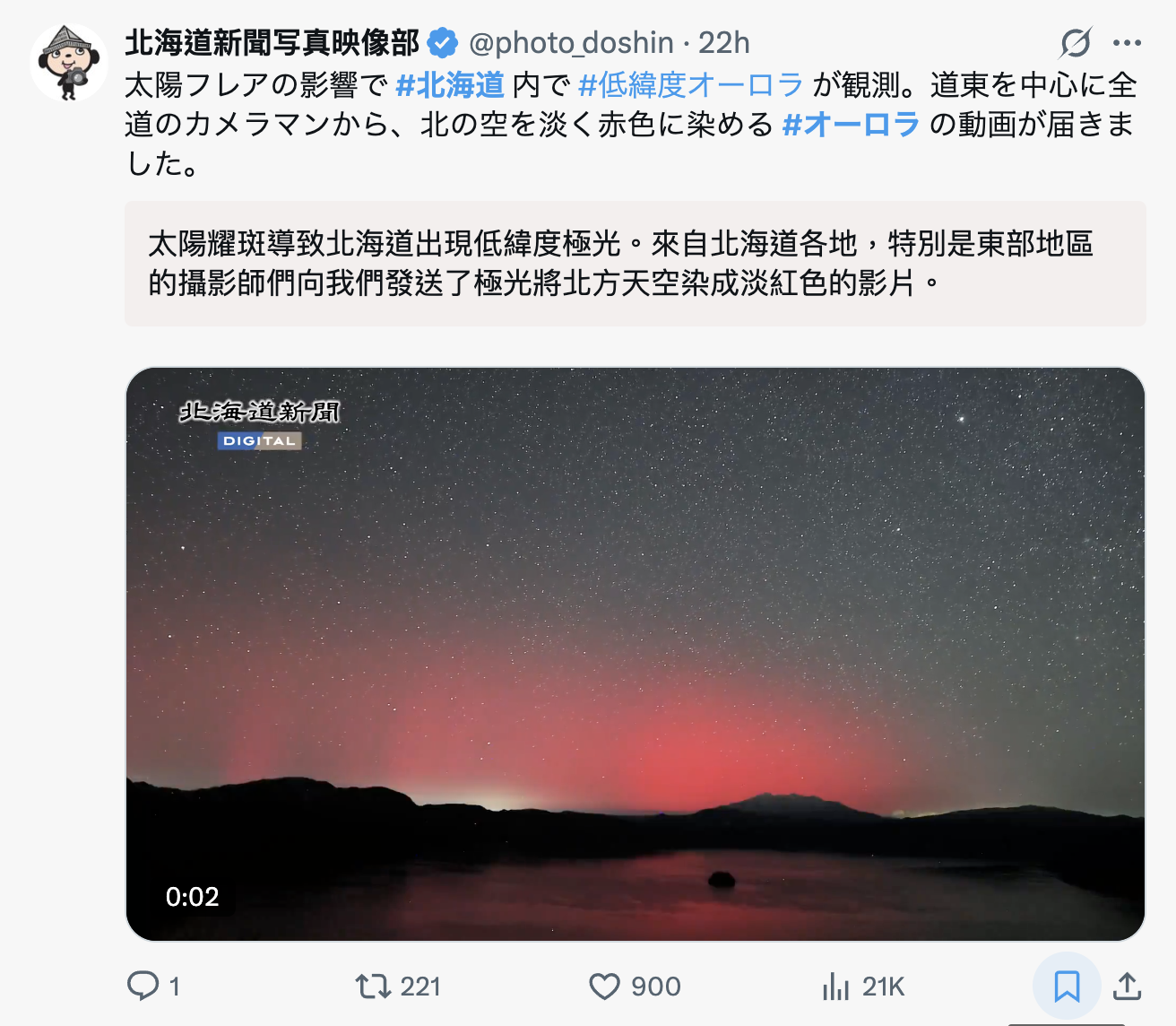 北海道近日因強烈地磁暴影響,夜空頻現罕見「低緯度極光」,以紅色為主,肉眼可見,持續數小時。尤其道東地區(網走、釧路、根室)及道南部分地區,多地旅客亦觀賞到極光。