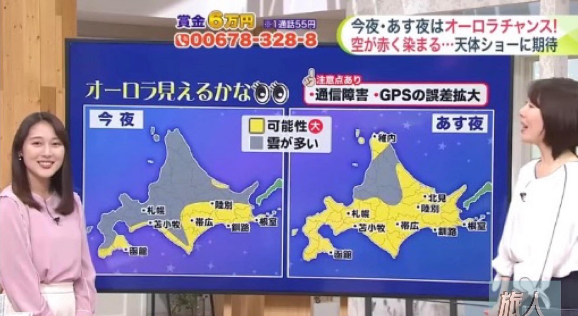 北海道道東(網走、釧路、根室)及道南部分地區光污染低、視野開闊,為本波極光首選: