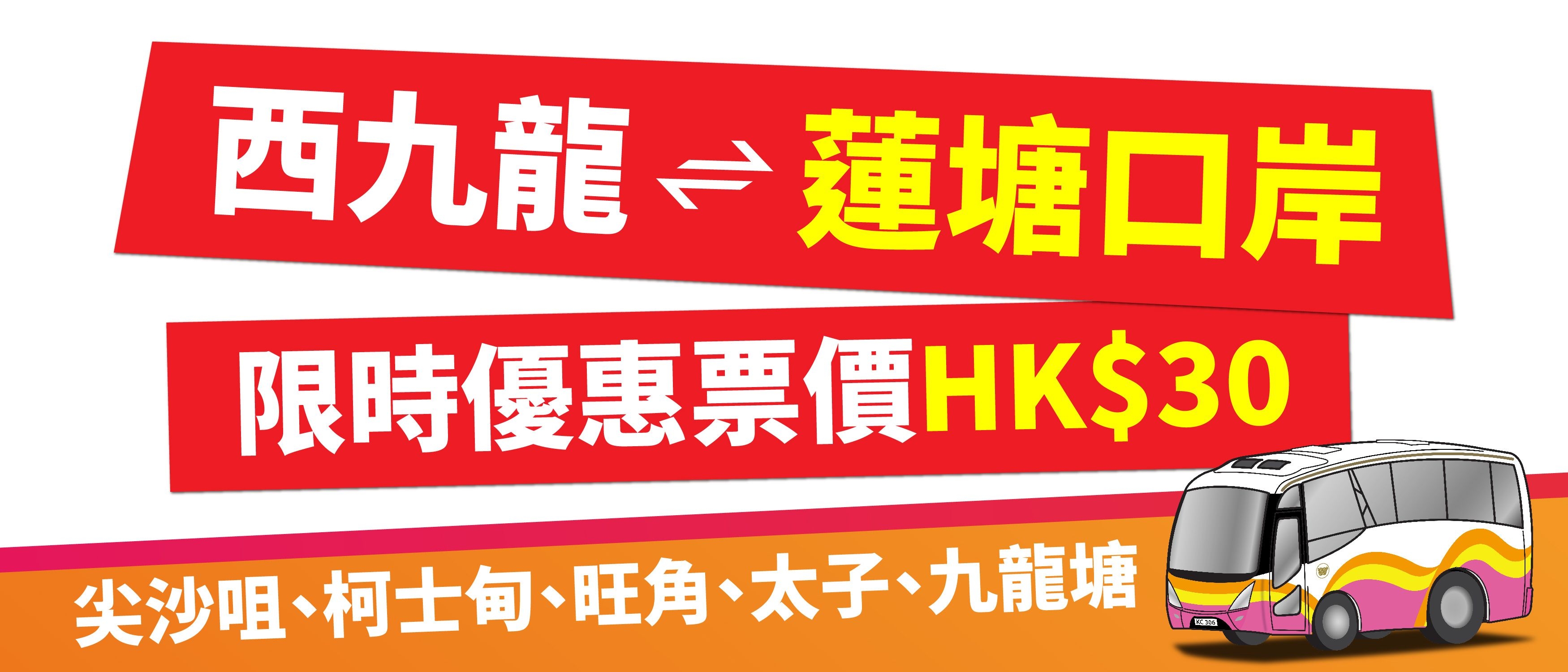環島中港通最新推出西九龍↔蓮塘口岸跨境巴士限時$30單程優惠,覆蓋尖沙咀、柯士甸、旺角、太子、九龍塘五大熱門上車點,班次密到每半小時一班,絕對是北上買餸、購物、返工首選!