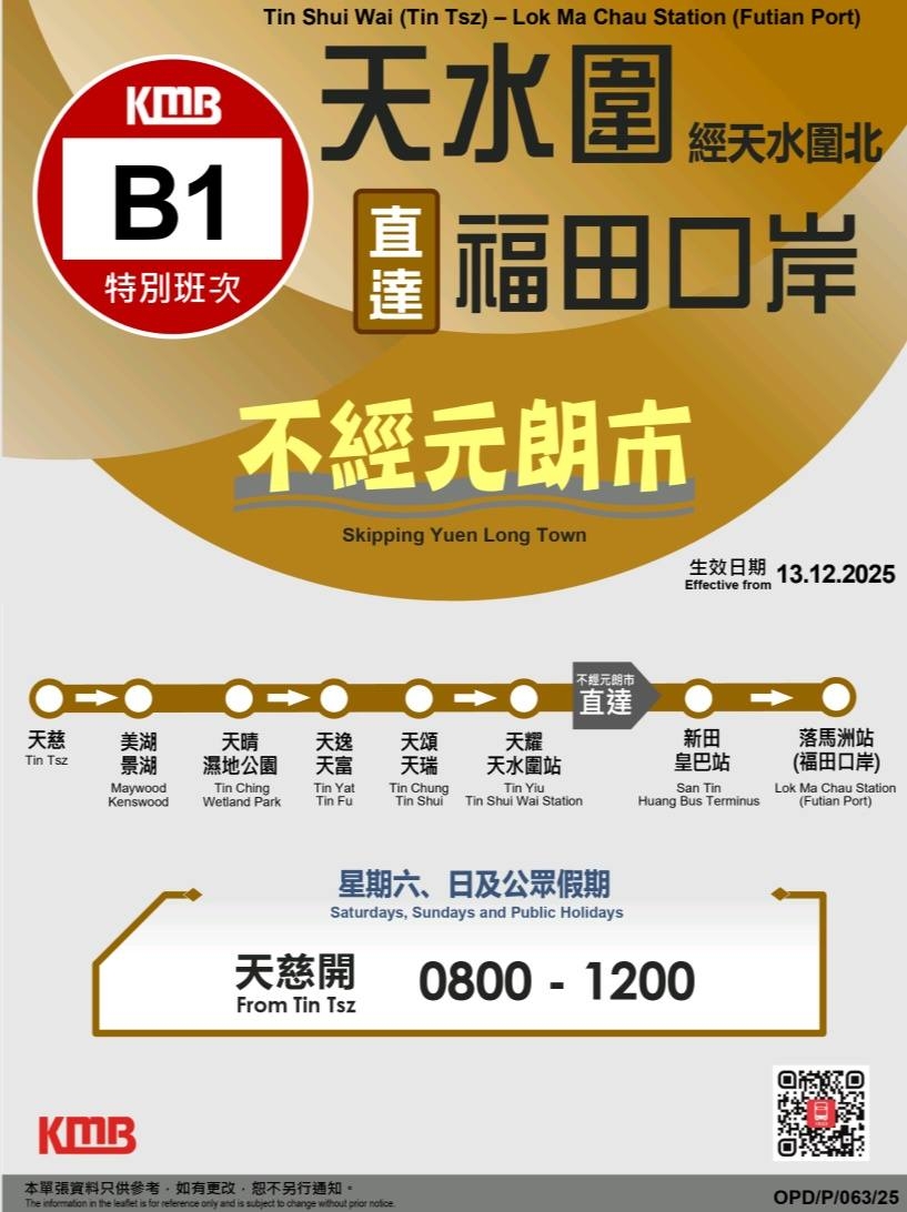 九巴B1線新增特快班次,主要服務天水圍居民。呢個特別安排由天慈邨開出,全程不經元朗,直接前往落馬洲福田口岸,取代咗之前由天恩邨出發嘅特別班次。