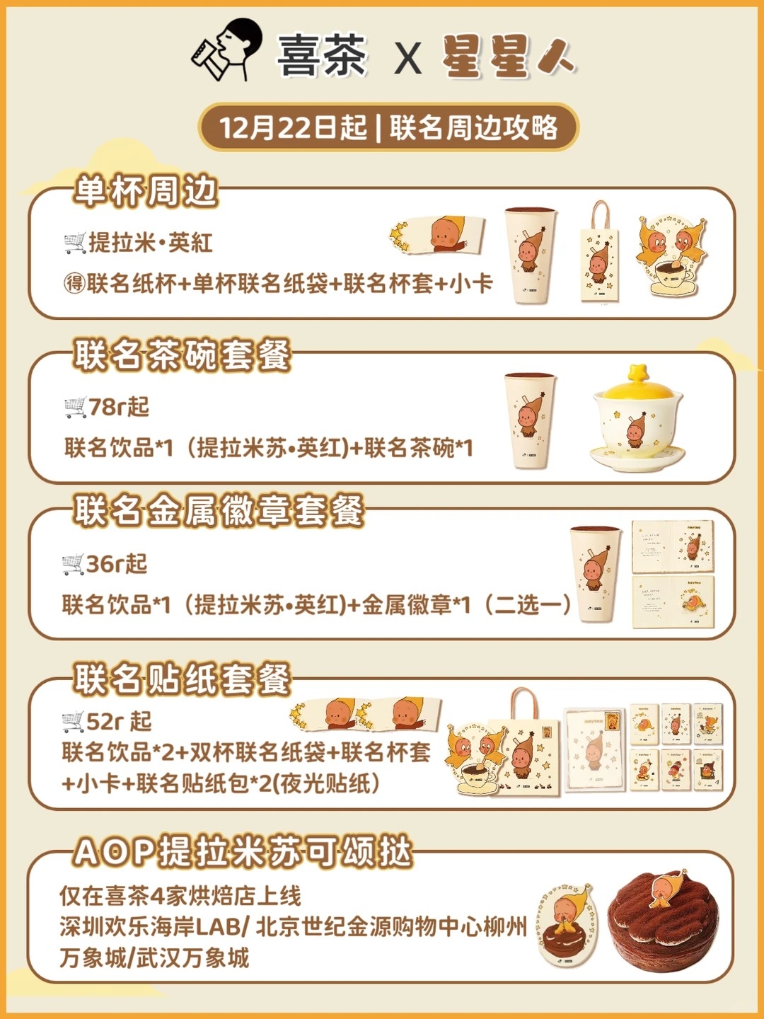 - 聯名茶碗套餐(¥78起) 購買提拉米蘇·英紅1杯,送限定茶碗1個(固定款式),每人限購1份。