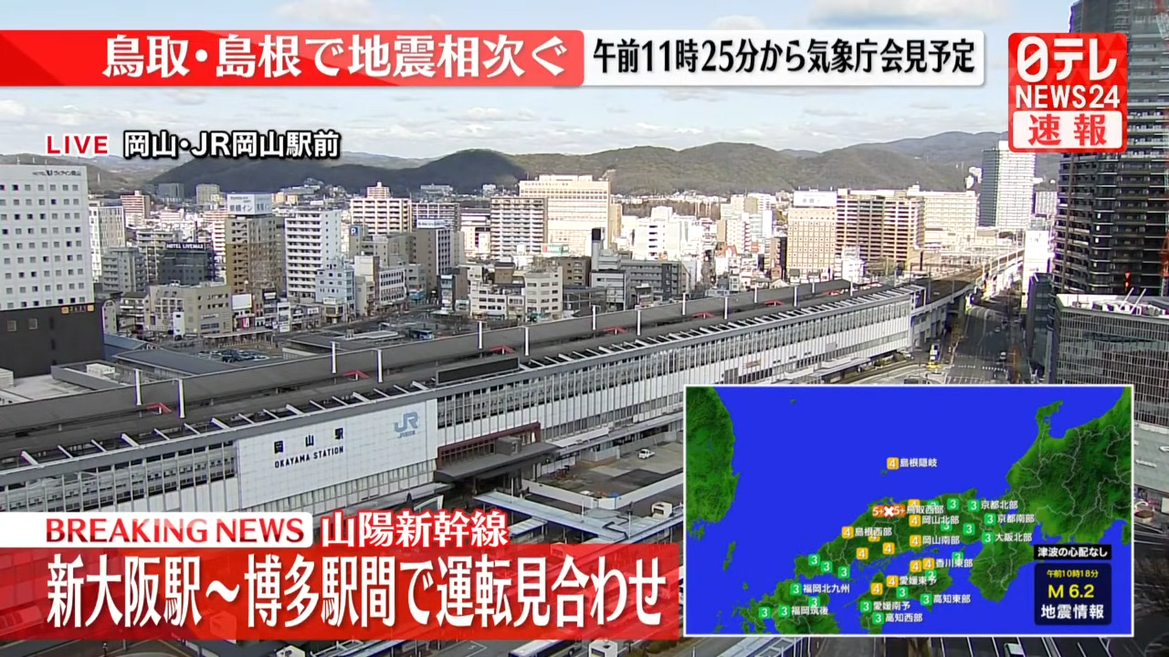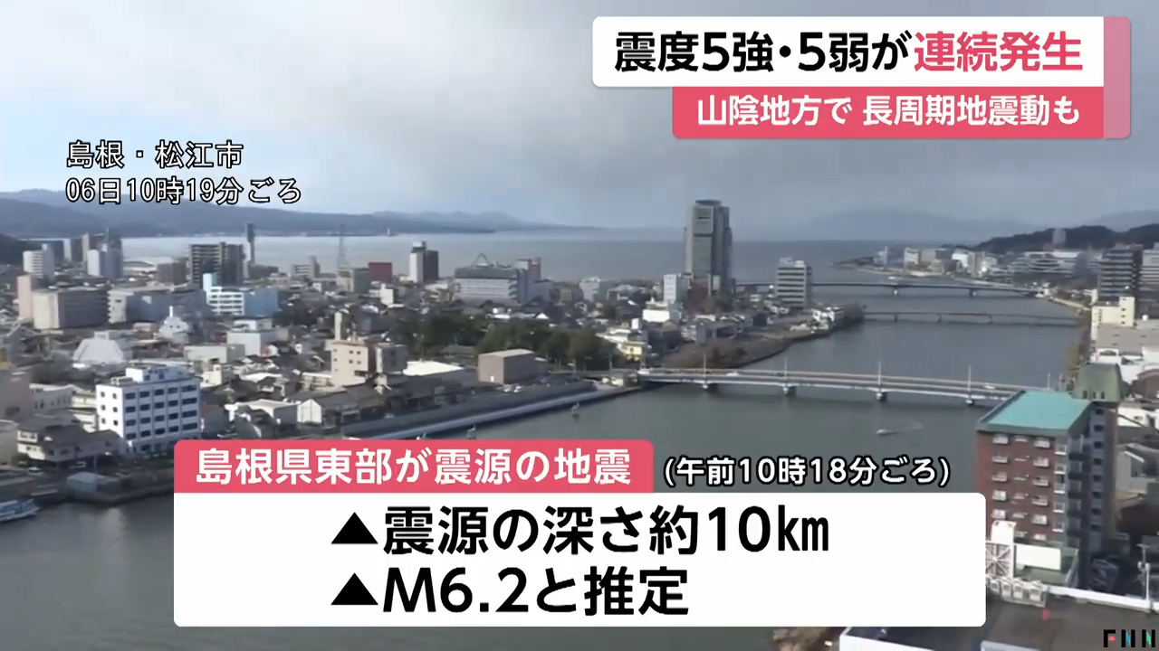 - 最大震度:5強,影響鳥取縣西部(境港市、日野町、江府町)及島根縣東部(松江市、安來市)。