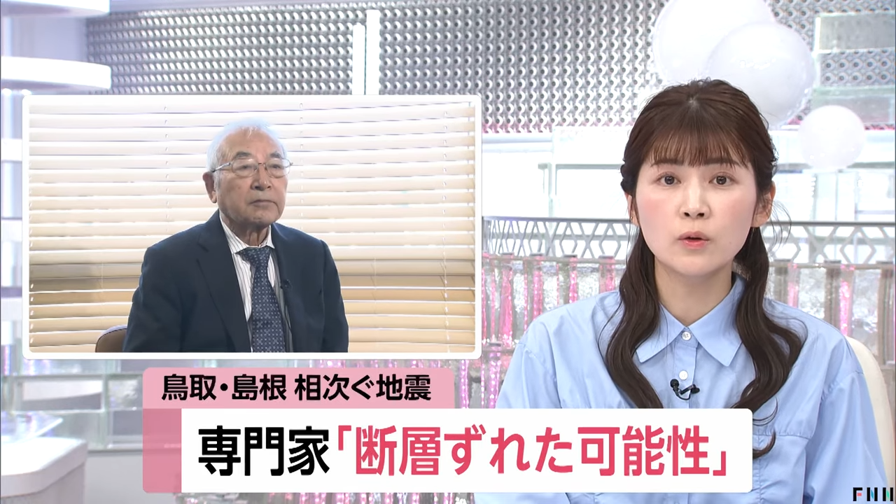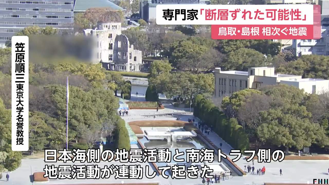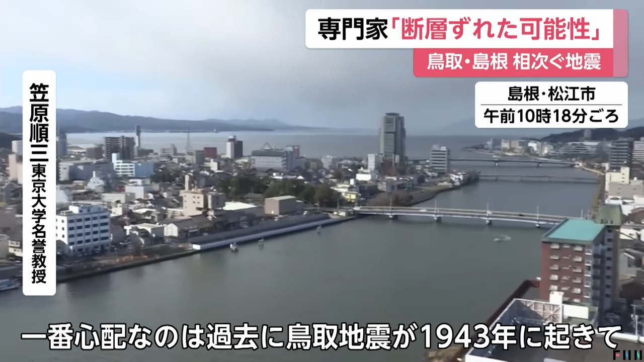 - 過去地震絕錄:1943年鳥取地震後(M7.2級,震度為6,鳥取市幾乎完全被催毁,市內80%房屋倒塌,死亡人數超過過1000人,是1943年死傷最嚴重的地震),翌年發生東南海地震(南海海槽巨大地震),再接南海地震,日本海側與南海海槽地震活動曾連動。