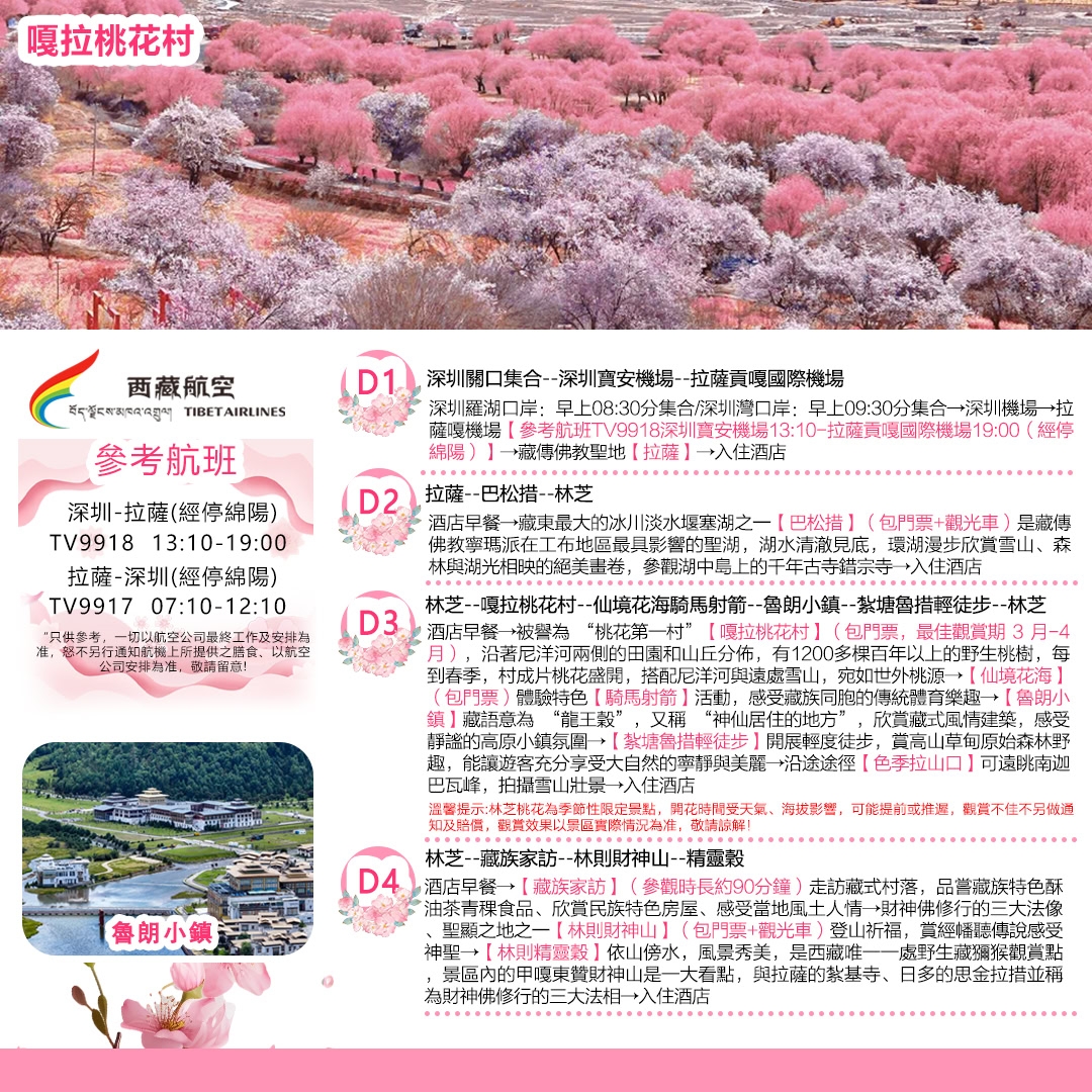 - 航班時間:去程TV9918 深圳13:10-拉薩19:00(經停綿陽);回程TV9917 拉薩07:10-深圳12:10(經停綿陽)