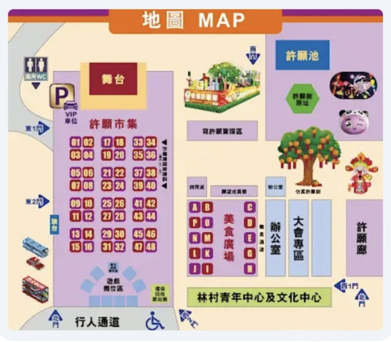 - 許願夜市(初二至初六2月18至22日延長至晚上9時):48個乾貨攤位、16個美食攤位加遊戲攤,食買玩一條龍