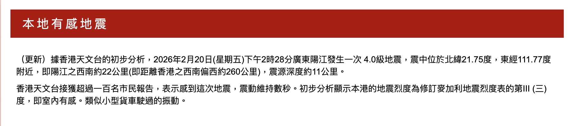 【香港地震/天文台】香港天文台確認2026年2月20日下午2時28分,廣東陽江西南發生4.0級地震,震中距離香港約22公里,多名香港市民報告感受到輕微震動,持續數秒無造成損壞。香港位處地震活躍帶,雖非板塊邊緣,但鄰近地區如南海常有中小型地震,本次事件無引發海嘯警報。