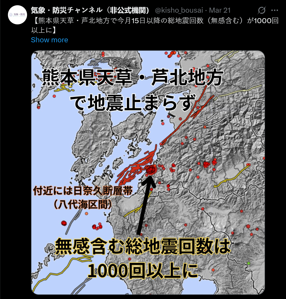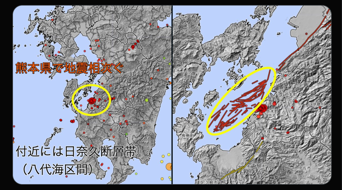 【日本地震/熊本地震/地震危機】日本熊本縣南部天草・蘆北地區自3月15日晚間起地震頻發,一週內(包含無感震動)總數已超過1000次,引發各界高度警惕。雖然目前最大規模僅4.0級、震度4級,暫無重大損壞,但專家認定這是典型的「群發地震」現象,顯示地底能量正密集釋放,區域結構脆弱,短期內不排除中等強度震動。該地緊鄰日奈久斷層帶對(日本政府評為30年內高機率強震的S級危險斷層),或會令該斷層帶造成間接影響而觸發更大規模地震。
