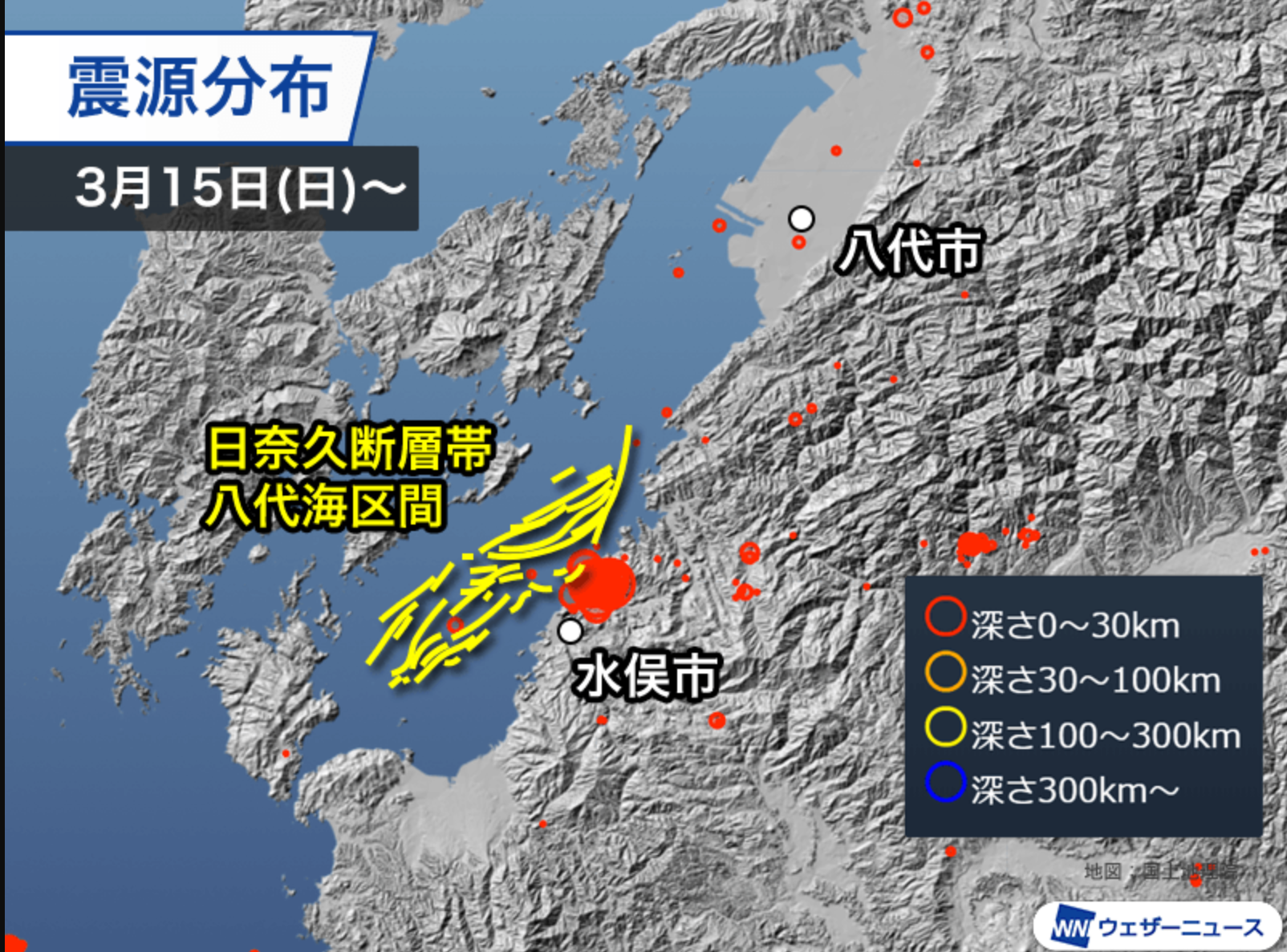 熊本縣這波地震從3月15日23時10分規模4.0主震(震源深度約10公里、最大震度4級)展開,之後每天都有多起有感震動。截至3月22日中午,有感地震累計約36次(早期報導至21日清晨為27次),其中震度4級1次、3級1次、2級數次,其餘多為1級。震源深度普遍淺(約10公里),位置高度集中於天草・蘆北一帶,尚未造成明顯傷亡或建築損毀。日本氣象廳持續監測,強調無海嘯風險。