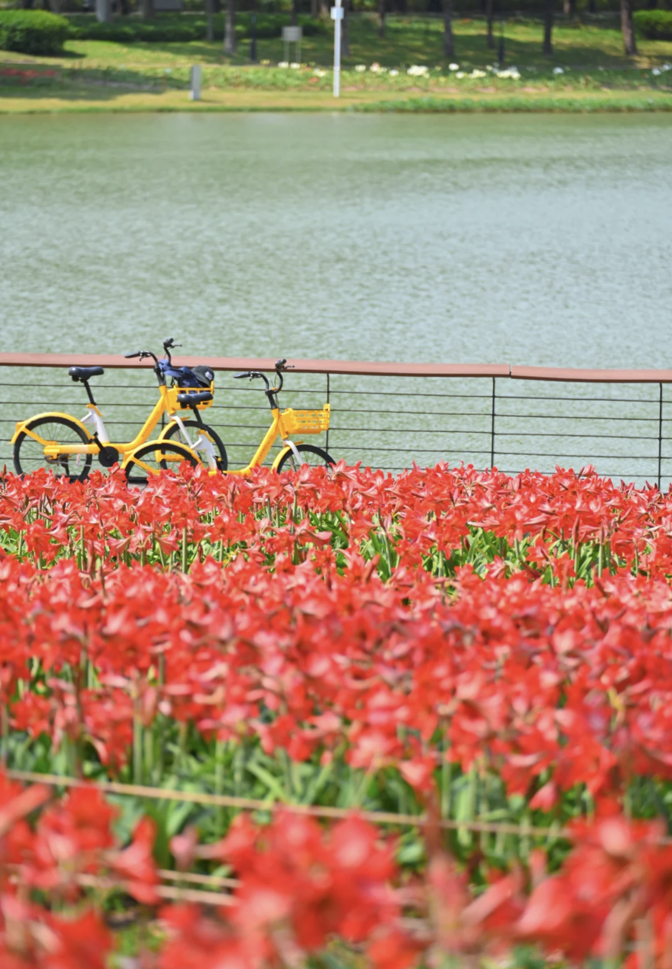 公園內的福田河畔,沿著小徑兩旁種植了不少朱頂紅。粉紅色品種與河邊的落羽松、垂柳相互映襯,倒映水中,充滿詩意。此處光線柔和,非常適合拍攝人像特寫。
