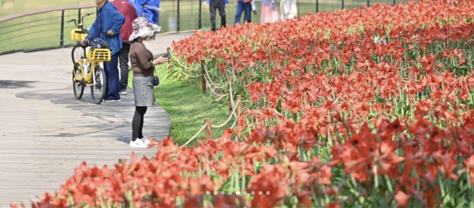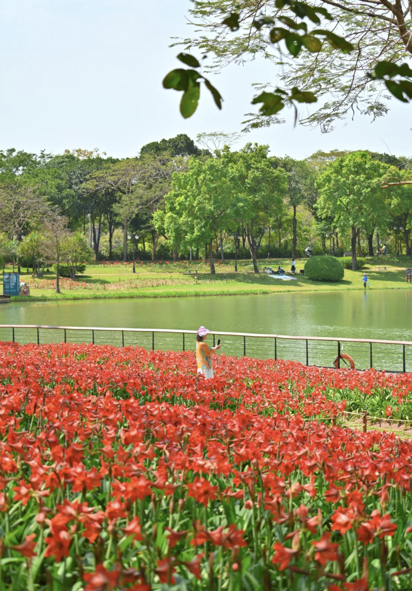 位於福田區的深圳中心公園,被譽為城市中的「綠色走廊」,有別於公園常見的杜鵑或月季,這裡栽種了大片罕見的朱頂紅。這種花卉花型碩大,色彩從純白、粉紅到艷紅不等,盛開時如一個個喇叭狀的華麗花球,整齊排列在綠茵草地上,形成獨特的視覺效果。公園免費入場,無需預約,是港人避開人潮、享受寧靜賞花體驗的隱世好去處。