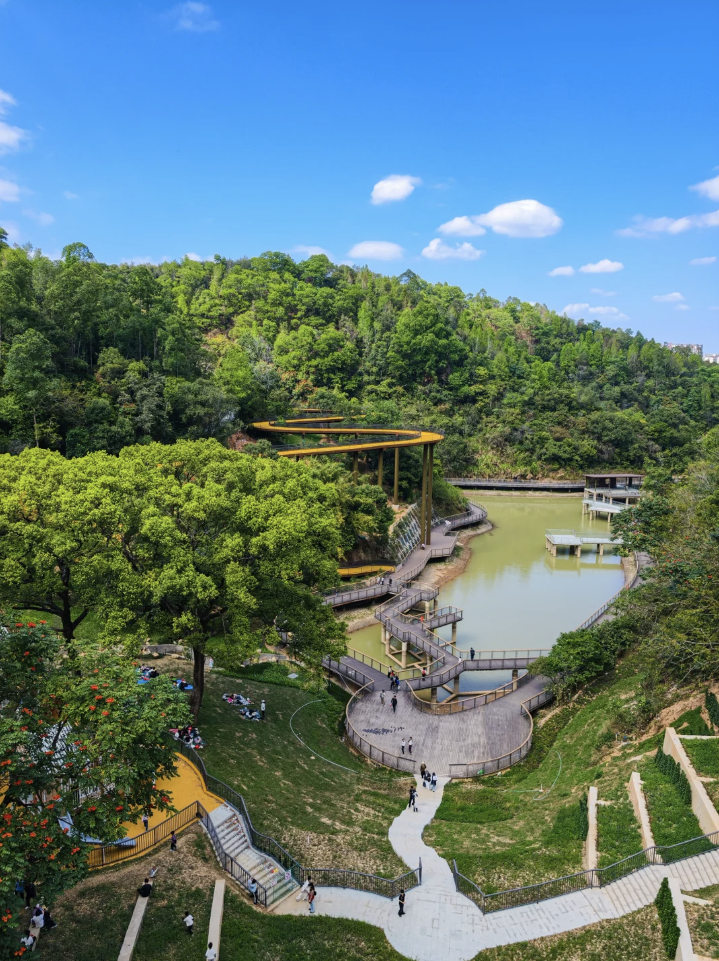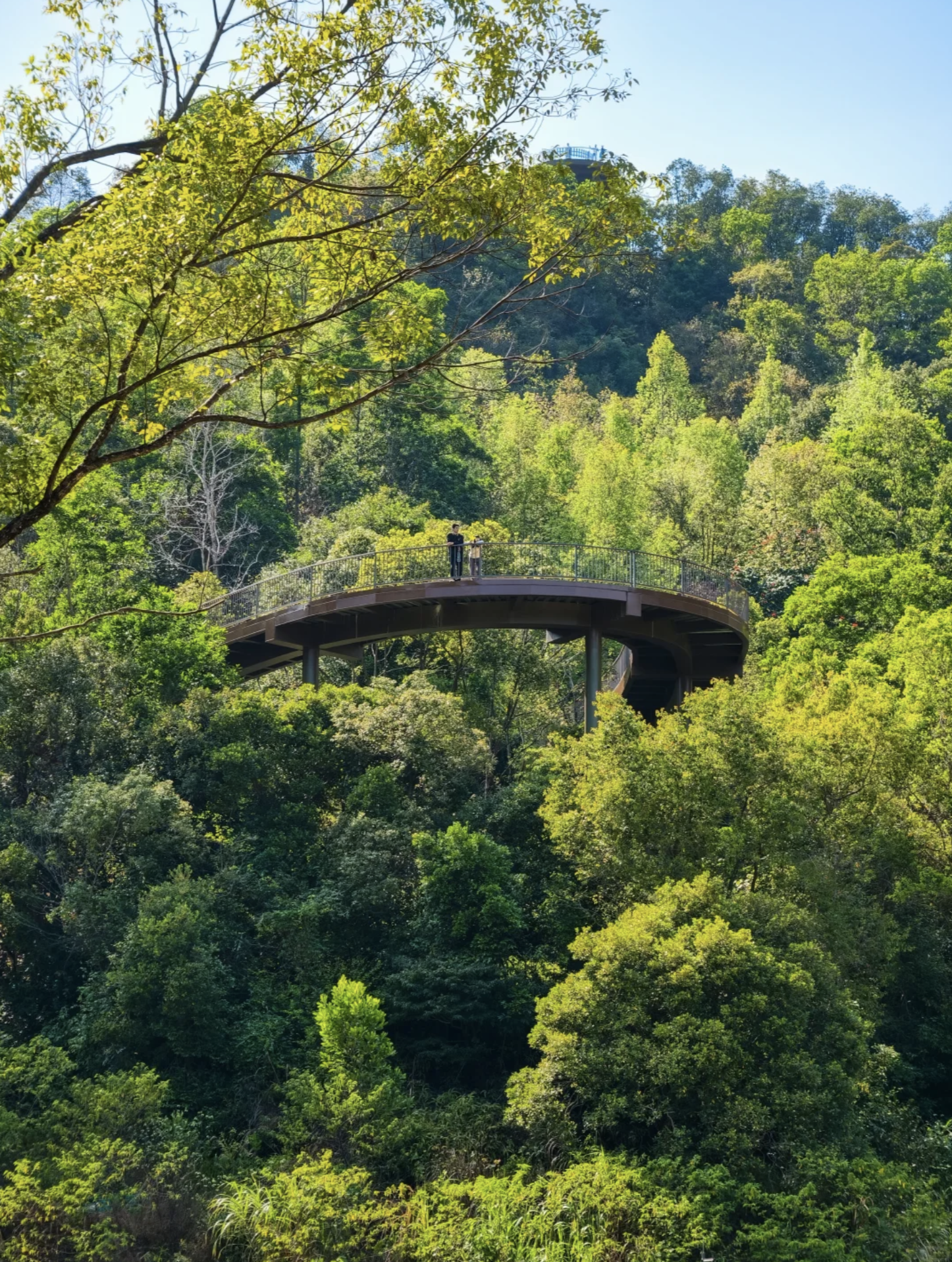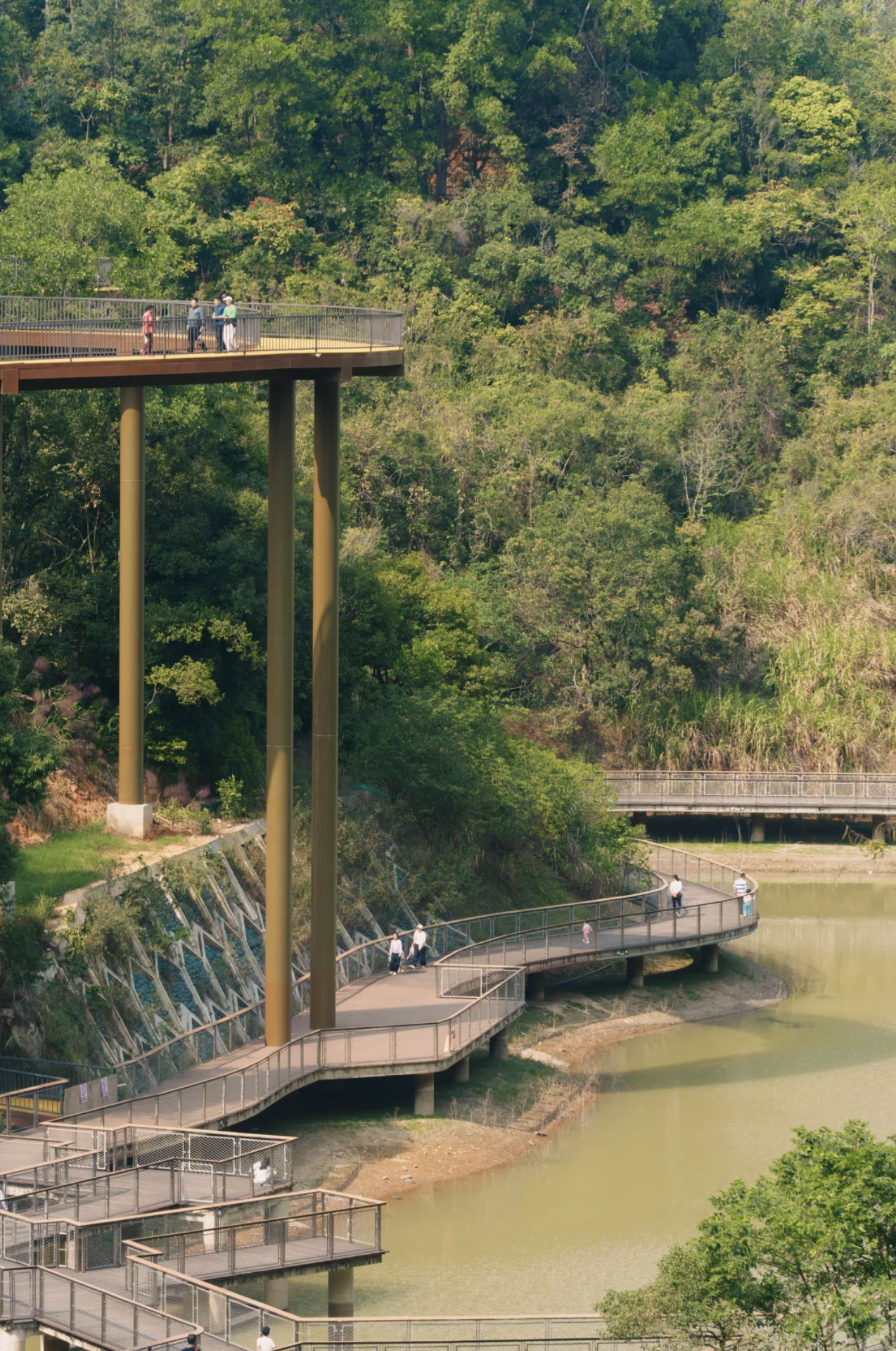 公園最標誌性的設施,非這條架空棧道莫屬。棧道以鋼結構搭建,蜿蜒穿梭於原始山林之間,離地數米至十數米不等。走在上面,腳下是婆娑樹影,身旁是翠綠林蔭,視野開揚,可以遠眺龍崗城景。步道平坦易行,適合一家大小慢慢散步,感受被大自然包圍的療癒感。