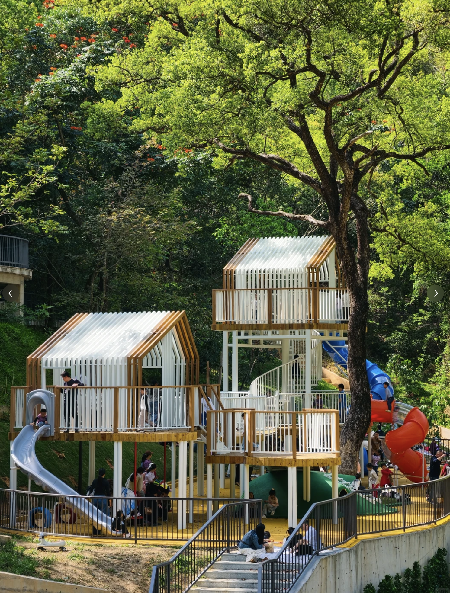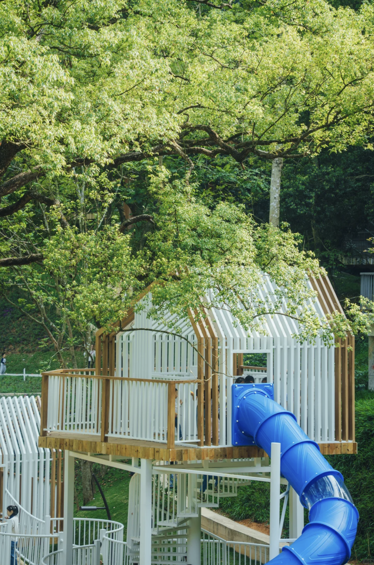 棧道中段設有以原木及玻璃建成的森林小屋,外形充滿童話色彩。小屋其實是一個多層觀景台,內有休息區及觀景窗,從高處可360度欣賞公園全景。陽光穿過樹葉灑落小屋,光影交錯,是拍照留念的最佳位置。