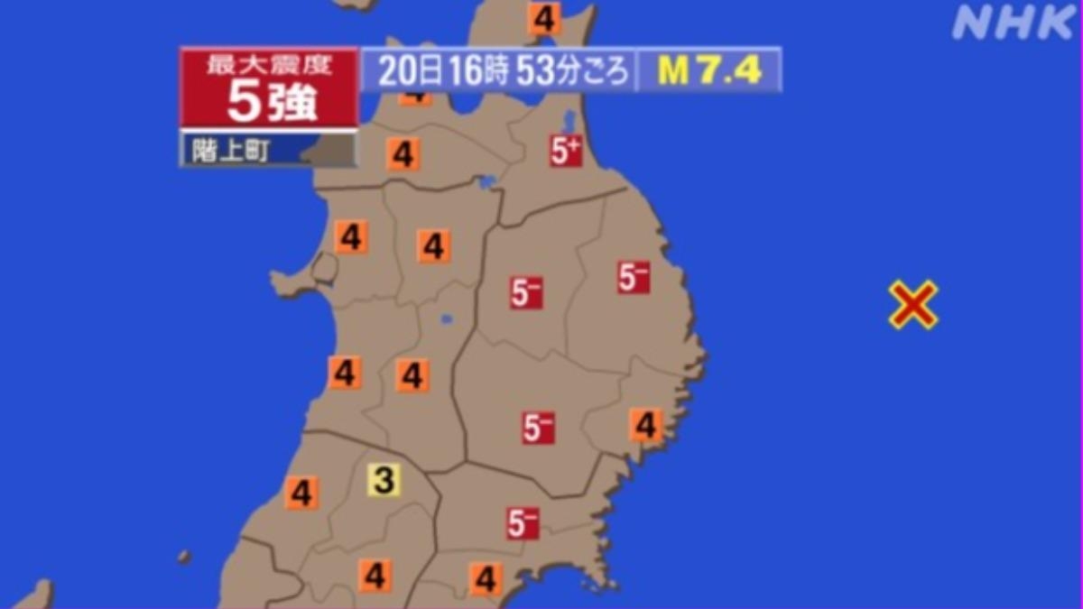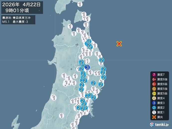 - 今晨(4月22日)日本時間09時01分(香港時間10時01分),青森縣東邊外海發生芮氏規模5.1地震,包括岩手縣、宮城縣等地都受到影響。