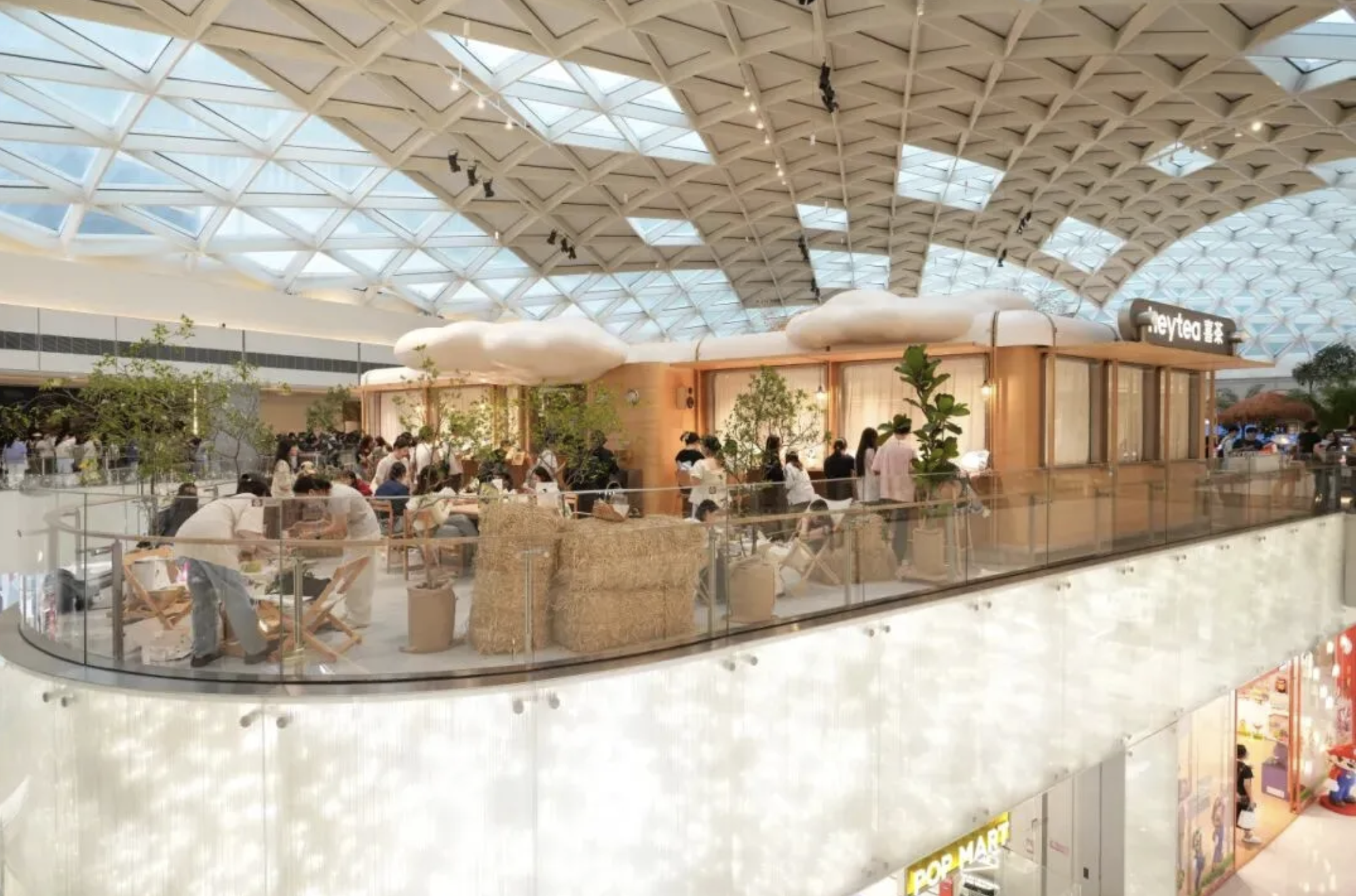 店面以「雲上」作為空間主題,從經典產品元素「芝芝雲頂」與Cake Lab的鬆軟屬性中提取靈感。設計融入雲朵、餐車、茶箱和草垛等自然元素,將傳統製備區打造成「雲上列車」,外擺客座區採用開放式設計,營造輕盈、放鬆的氛圍,非常適合拍照打卡。