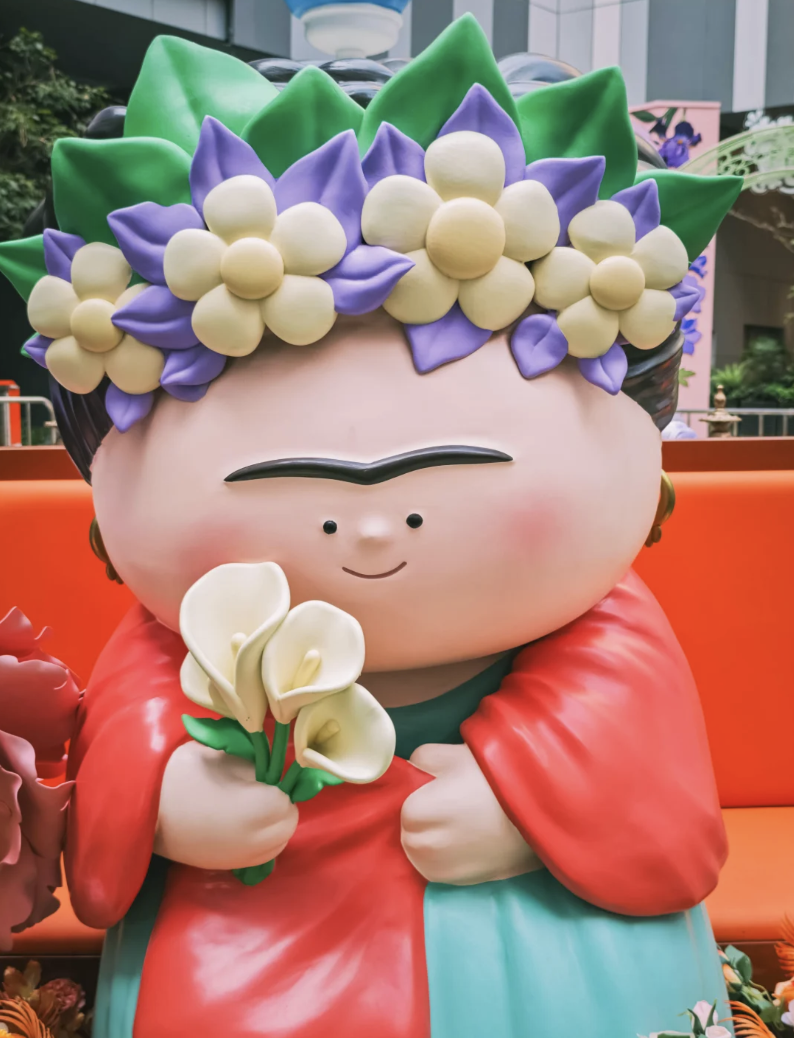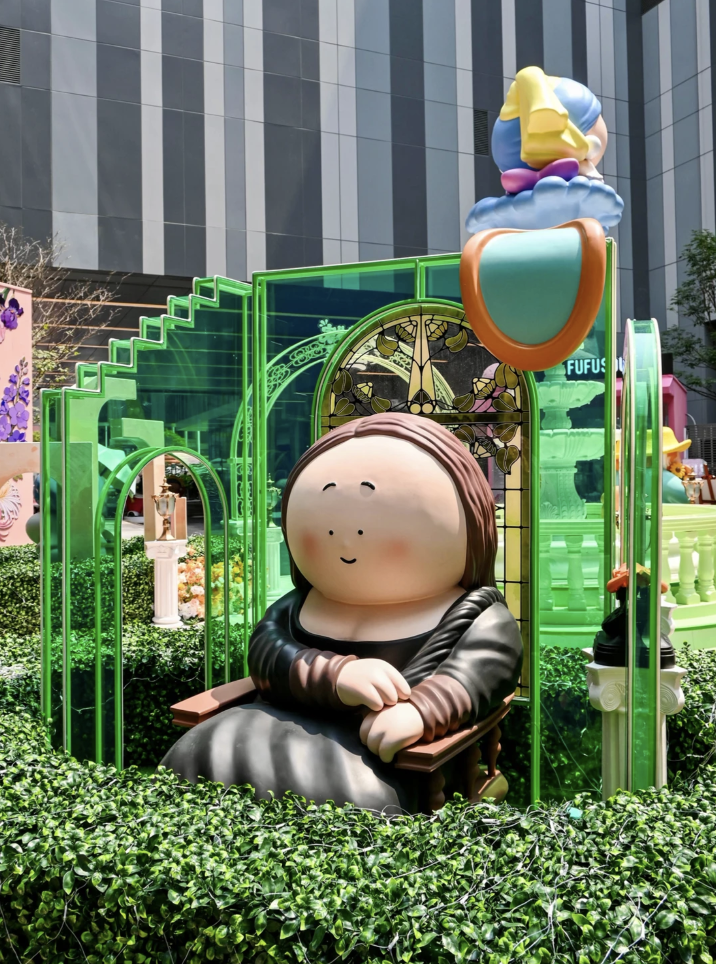 - 周圍綠灌木中坐著梵高、弗里達、蒙娜麗莎和撐傘的女人。