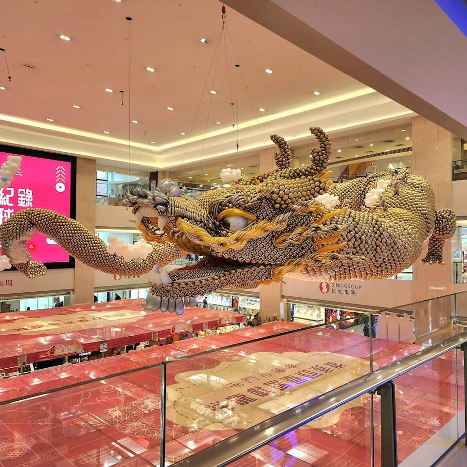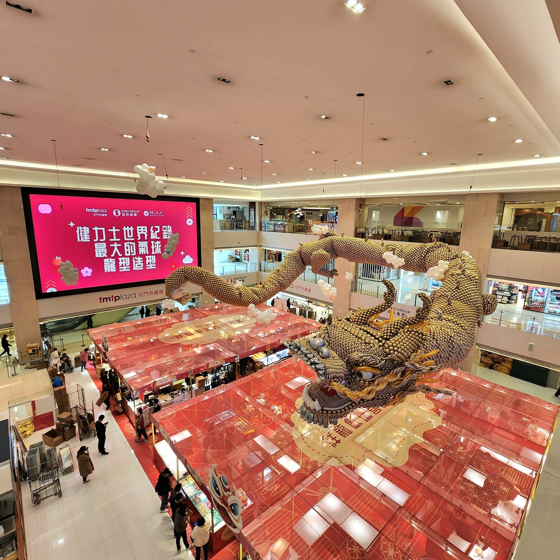 龍年快到,屯門近日一個商場驚現氣球飛龍新年裝置!屯門市廣場中庭位置,現正製作, 條以多達38,000個氣球組成的東方巨龍,非常壯觀。據網民的照片所見,飛龍由多個金黃色氣球組成,腹部則用上白色氣球,懸掛在商場中庭位置。頭部近鏡可以見到龍牙及龍鬚等細節,龍鬚和龍眉用長條形氣球扭成,形態好逼真。