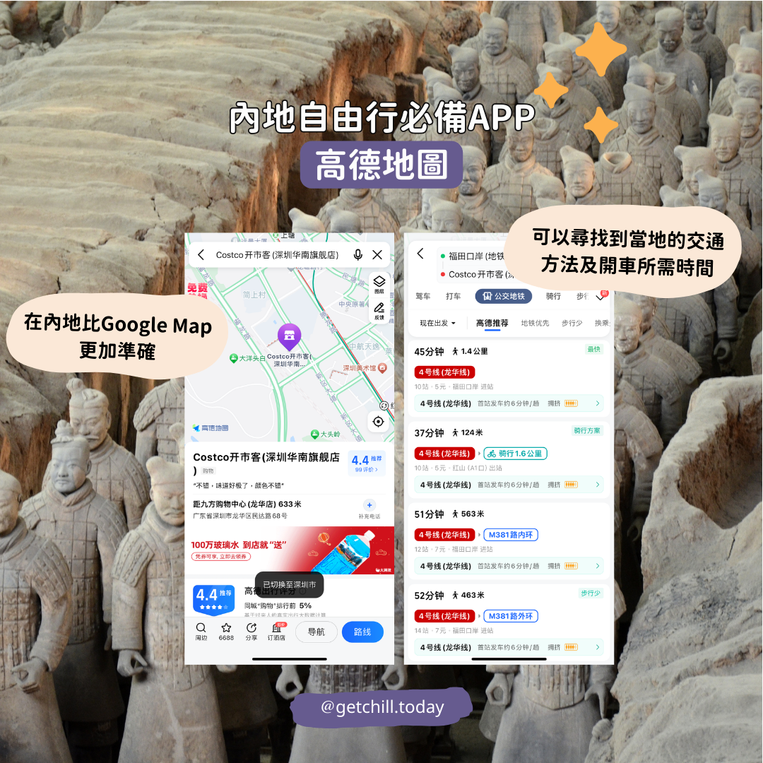 - 高德地圖:在內地比Google Map更加準確,可以尋找到當地的交通方法及開車所需時間