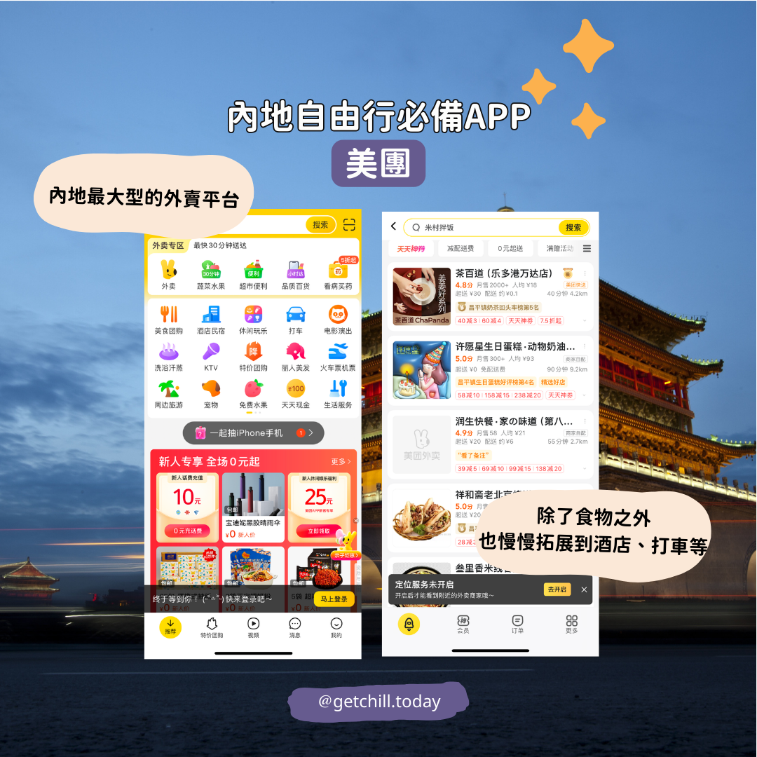 4. 美團:內地最大型的外賣平台,除了食物之外也慢慢拓展到酒店、打車等